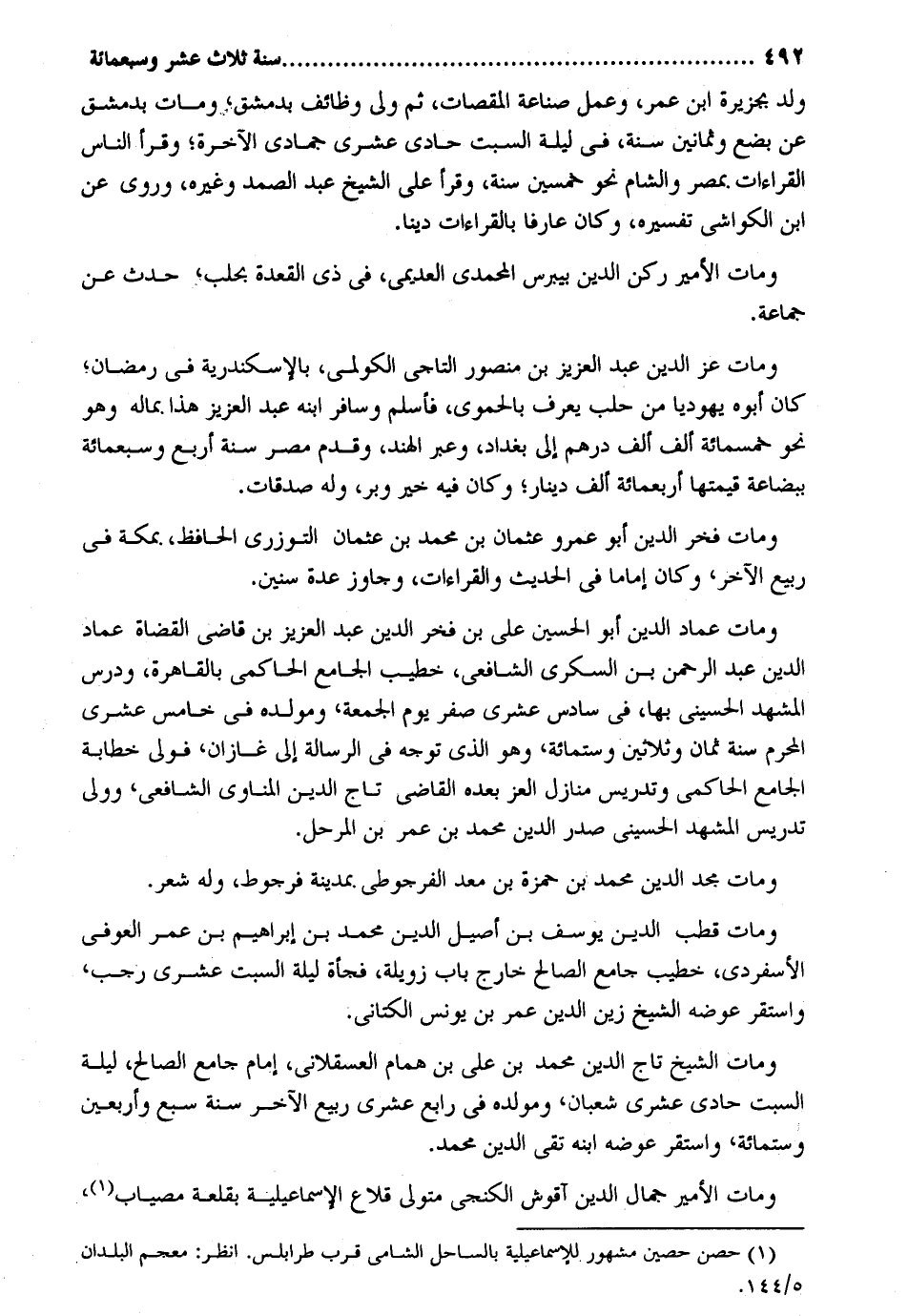 ولد بِجَزِيرَة ابْن عمر، وَعمل صناعَة المقصات، ثمَّ ولي وظائف بِدِمَشْق، وَمَات بِدِمَشْق عَن بضع وَثَمَانِينَ سنة، فِي لَيْلَة السبت حادي عشرى جُمَادَى الْآخِرَة؛ وَقَرَأَ النَّاس الْقرَاءَات بِمصْر وَالشَّام نَحْو خمسين سنة، وَقَرَأَ على الشَّيْخ عبد الصَّمد وَغَيره، وروى عَن ابْن الكواشي تَفْسِيره، وَكَانَ عَارِفًا بالقراءات دينا. وَمَات الْأَمِير ركن الدّين بيبرس المحمدي العديمي، فِي ذِي الْقعدَة بحلب، حدث عَن جمَاعَة. وَمَات عز الدّين عبد الْعَزِيز بن مَنْصُور التاجي الكولمي، بالإسكندرية فِي رَمَضَان، كَانَ أَبوهُ يَهُودِيّا من حلب يعرف بالحموي، فَأسلم وسافر ابْنه عبد الْعَزِيز هَذَا بِمَالِه وَهُوَ ببضاعة قيمتهَا أَرْبَعمِائَة ألف دِينَار؛ وَكَانَ فِيهِ خير وبر، وَله صدقَات. وَمَات فَخر الدّين أَبُو عَمْرو عُثْمَان بن مُحَمَّد بن عُثْمَان التوزري الْحَافِظ، بِمَكَّة فِي ربيع الآخر، وَكَانَ إِمَامًا فِي الحَدِيث والقراءات، وَجَاوَزَ عدَّة سِنِين. وَمَات عماد الدّين أَبُو الْحُسَيْن عَليّ بن فَخر الدّين عبد الْعَزِيز بن قَاضِي الْقُضَاة عماد الدّين عبد الرَّحْمَن بن السكرِي الشَّافِعِي، خطيب الْجَامِع لحاكمي بِالْقَاهِرَةِ، ودرس المشهد الْحُسَيْنِي بهَا، فِي سادس عشرى صفر يَوْم الْجُمُعَة، ومولده فِي خَامِس عشرى الْمحرم سنة ثَمَان وَثَلَاثِينَ وسِتمِائَة، وَهُوَ الَّذِي توجه فِي الرسَالَة إِلَى غازان، فولى خطابة الْجَامِع الحاكمي وتدريس منَازِل الْعِزّ بعده القَاضِي تَاج الدّين الْمَنَاوِيّ الشَّافِعِي، وَولي تدريس المشهد الْحُسَيْنِي صدر الدّين مُحَمَّد بن عمر بن المرحل. وَمَات مجد الدّين مُحَمَّد بن حَمْزَة بن معد الفرجوطي بِمَدِينَة فرجوط، وَله شعر. وَمَات قطب الدّين يُوسُف بن أصيل الدّين مُحَمَّد بن إِبْرَاهِيم بن عمر الْعَوْفِيّ الأسفردي، خطيب جَامع الصَّالح خَارج بَاب زويلة، فَجْأَة لَيْلَة السبت عشرى رَجَب، وَاسْتقر عوضه الشَّيْخ زين الدّين عمر بن يُونُس الكتاني. وَمَات الشَّيْخ تَاج الدّين مُحَمَّد بن عَليّ بن همام الْعَسْقَلَانِي، إِمَام جَامع الصَّالح، لَيْلَة السبت حادي عشرى شعْبَان، ومولده فِي رَابِع عشرى ربيع الآخر سنة سبع وَأَرْبَعين وسِتمِائَة، وَاسْتقر عوضه ابْنه تَقِيّ الدّين مُحَمَّد. وَمَات الْأَمِير جمال الدّين آقوش الكنجي مُتَوَلِّي قلاع الإسماعيلية بقلعة مصياب،