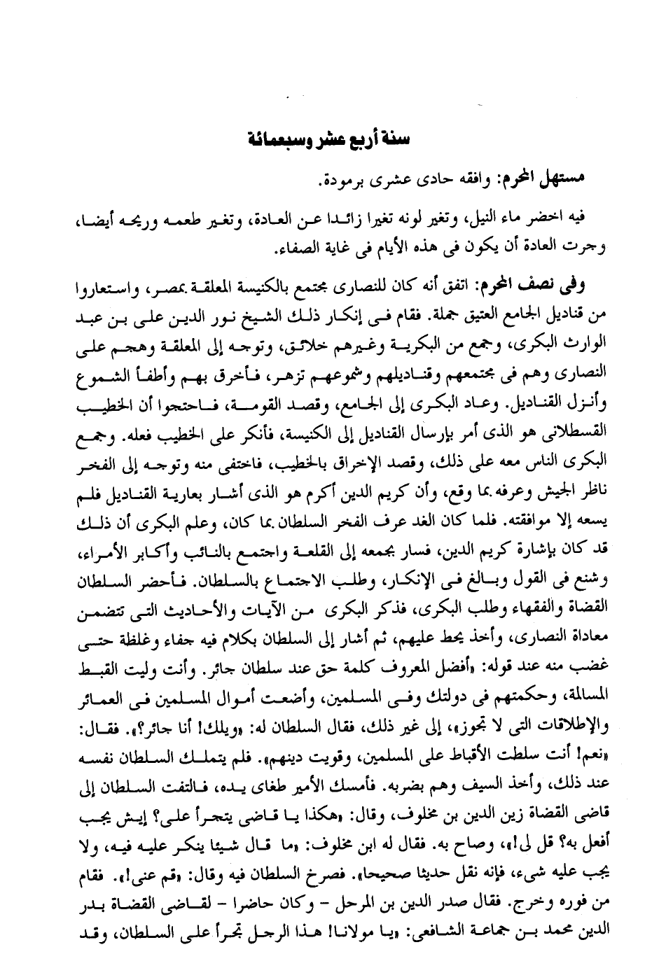 مستهل الْمحرم: وَافقه حادي عشرى برمودة. فِيهِ اخضر مَاء النّيل، وَتغَير لَونه تغيرا زَائِدا عَن الْعَادة، وَتغَير طعمه وريحه أَيْضا، وَجَرت الْعَادة أَن يكون فِي هَذِه الْأَيَّام فِي غَايَة الصفاء. وَفِي نصف الْمحرم: اتّفق أَنه كَانَ لِلنَّصَارَى مُجْتَمع بالكنيسة الْمُعَلقَة بِمصْر، واستعاروا من قناديل الْجَامِع الْعَتِيق جملَة. فَقَامَ فِي إِنْكَار ذَلِك الشَّيْخ نور الدّين عَليّ بن عبد الْوَارِث الْبكْرِيّ، وَجمع من البكرية وَغَيرهم خلائق، وَتوجه إِلَى الْمُعَلقَة وهجم على النَّصَارَى وهم فِي مجتمعهم وقناديلهم وشموعهم تزهر، فأخرق بهم وأطفأ الشموع وَأنزل الْقَنَادِيل. وَعَاد الْبكْرِيّ إِلَى الْجَامِع، وَقصد القومة، فاحتجوا أَن الْخَطِيب الْقُسْطَلَانِيّ هُوَ الَّذِي أَمر بإرسال الْقَنَادِيل إِلَى الْكَنِيسَة، فَأنْكر عَليّ الْخَطِيب فعله. وَجمع الْبكْرِيّ النَّاس مَعَه على ذَلِك، وَقصد الإخراق بالخطيب، فاختفى مِنْهُ وَتوجه إِلَى الْفَخر نَاظر الْجَيْش وعرفه بِمَا وَقع، وَأَن كريم الدّين أكْرم هُوَ الَّذِي أَشَارَ بعارية الْقَنَادِيل فَلم يَسعهُ إِلَّا مُوَافَقَته. فَلَمَّا كَانَ الْغَد عرف الْفَخر السُّلْطَان بِمَا كَانَ، وَعلم الْبكْرِيّ أَن ذَلِك قد كَانَ بِإِشَارَة كريم الدّين، فَسَار بجمعه إِلَى القلعة وَاجْتمعَ بالنائب وأكابر الْأُمَرَاء، وشنع فِي القَوْل وَبَالغ فِي الْإِنْكَار، وَطلب الِاجْتِمَاع بالسلطان. فأحضر السُّلْطَان الْقُضَاة وَالْفُقَهَاء وَطلب الْبكْرِيّ، فَذكر الْبكْرِيّ من الْآيَات وَالْأَحَادِيث الَّتِي تَتَضَمَّن معاداة النَّصَارَى، وَأخذ يحط عَلَيْهِم، ثمَّ أَشَارَ إِلَى السُّلْطَان بِكَلَام فِيهِ جفَاء وغلظة حَتَّى غضب مِنْهُ عِنْد قَوْله: " أفضل الْمَعْرُوف كلمة حق عِنْد سُلْطَان جَائِر. وَأَنت وليت القبط المسالمة، وحكمتهم فِي دولتك وَفِي الْمُسلمين، وأضعت أَمْوَال الْمُسلمين فِي العمائر والإطلاقات الَّتِي لَا يجوز "، إِلَى غير ذَلِك، فَقَالَ السُّلْطَان لَهُ: " وَيلك {أَنا جَائِر؟ ". فَقَالَ: " نعم} أَنْت سلطت الأقباط على الْمُسلمين، وقويت دينهم ". فَلم يتَمَلَّك السُّلْطَان نَفسه عِنْد ذَلِك، وَأخذ السَّيْف وهم بضربه. فَأمْسك الْأَمِير طغاي يَده، فَالْتَفت السُّلْطَان إِلَى قَاضِي الْقُضَاة زين الدّين بن مخلوف، وَقَالَ: " هَكَذَا يَا قَاضِي يتجرأ عَليّ؟ إيش يجب أفعل بِهِ؟ قل لي {" وَصَاح بِهِ. فَقَالَ لَهُ ابْن مخلوف: " مَا قَالَ شَيْئا يُنكر عَلَيْهِ فِيهِ، وَلَا يجب عَلَيْهِ شَيْء، فَإِنَّهُ نقل حَدِيثا صَحِيحا ". فَصَرَخَ السُّلْطَان فِيهِ وَقَالَ: " قُم عني} ". فَقَامَ من فوره وَخرج. فَقَالَ صدر الدّين بن المرحل - وَكَانَ حَاضرا - لقَاضِي الْقُضَاة بدر الدّين مُحَمَّد بن جمَاعَة الشَّافِعِي: " يَا مَوْلَانَا! هَذَا الرجل تجرأ على السُّلْطَان، وَقد