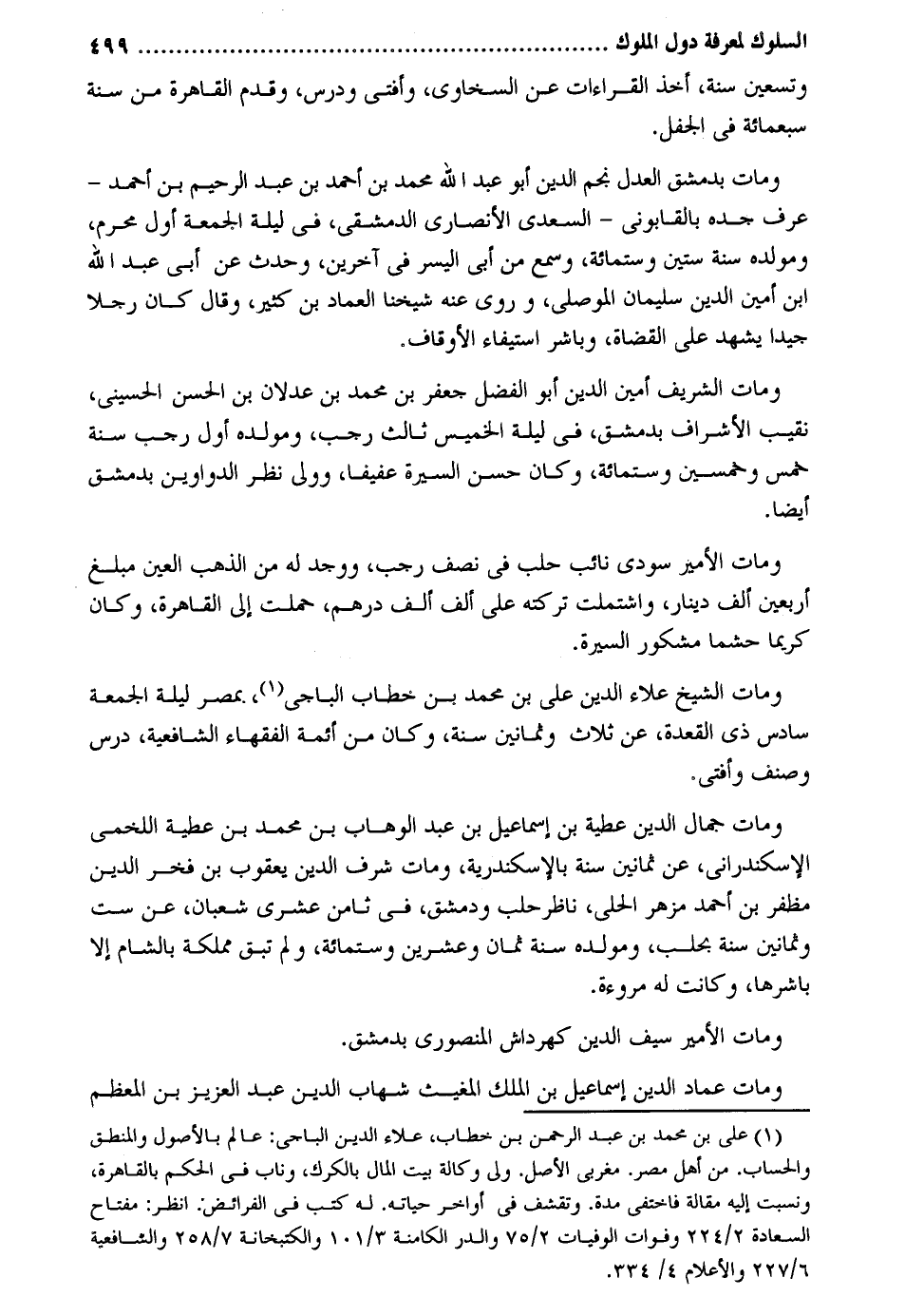 وَتِسْعين سنة، أَخذ الْقرَاءَات عَن السخاوي، وَأفْتى ودرس، وَقدم الْقَاهِرَة من سنة سَبْعمِائة فِي الجفل. وَمَات بِدِمَشْق الْعدْل نجم الدّين أَبُو عبد الله مُحَمَّد بن أَحْمد بن عبد الرَّحِيم بن أَحْمد - عرف جده بالقابوني - السَّعْدِيّ الْأنْصَارِيّ الدِّمَشْقِي، فِي لَيْلَة الْجُمُعَة أول محرم، ومولده سنة سِتِّينَ وسِتمِائَة، وَسمع من أبي السّير فِي آخَرين، وَحدث عَن أبي عبد الله ابْن أَمِين الدّين سُلَيْمَان الْموصِلِي، وروى عَنهُ شَيخنَا الْعِمَاد بن كثير، وَقَالَ كَانَ رجلا جيدا يشْهد على الْقُضَاة، وباشر اسْتِيفَاء الْأَوْقَاف. وَمَات الشريف أَمِين الدّين أَبُو الْفضل جَعْفَر بن مُحَمَّد بن عَدْلَانِ بن الْحسن الْحُسَيْنِي، نقيب الْأَشْرَاف بِدِمَشْق، فِي لَيْلَة الْخَمِيس ثَالِث رَجَب، ومولده أول رَجَب سنة خمس وَخمسين وسِتمِائَة، وَكَانَ حسن السِّيرَة عفيفا، وَولي نظر الدَّوَاوِين بِدِمَشْق أَيْضا. وَمَات الْأَمِير سودي نَائِب حلب فِي نصف رَجَب، وَوجد لَهُ من الذَّهَب الْعين مبلغ أَرْبَعِينَ ألف دِينَار، واشتملت تركته على ألف ألف دِرْهَم، حملت إِلَى الْقَاهِرَة، وَكَانَ كَرِيمًا حشما مشكور السِّيرَة. وَمَات الشَّيْخ عَلَاء الدّين عَليّ بن مُحَمَّد بن خطاب الْبَاجِيّ، بِمصْر لَيْلَة الْجُمُعَة سادس ذِي الْقعدَة، عَن ثَلَاث وَثَمَانِينَ سنة، وَكَانَ من أَئِمَّة الْفُقَهَاء الشَّافِعِيَّة، درس وصنف وَأفْتى. وَمَات جمال الدّين عَطِيَّة بن إِسْمَاعِيل بن عبد الْوَهَّاب بن مُحَمَّد بن عَطِيَّة اللَّخْمِيّ الإسْكَنْدراني، عَن ثَمَانِينَ سنة بالإسكندرية، وَمَات شرف الدّين يَعْقُوب بن فَخر الدّين مظفر بن أَحْمد مزهر الحلى، نَاظر حلب ودمشق، فِي ثامن عشرى شبعان، عَن سِتّ وَثَمَانِينَ سنة بحلب، ومولده سنة ثَمَان وَعشْرين وسِتمِائَة، وَلم تبْق مملكة بِالشَّام إِلَّا بَاشَرَهَا، وَكَانَت لَهُ مُرُوءَة. وَمَات الْأَمِير سيف الدّين كهرداش المنصوري بِدِمَشْق. وَمَات عماد الدّين إِسْمَاعِيل بن الْملك المغيث شهَاب الدّين عبد الْعَزِيز بن الْمُعظم