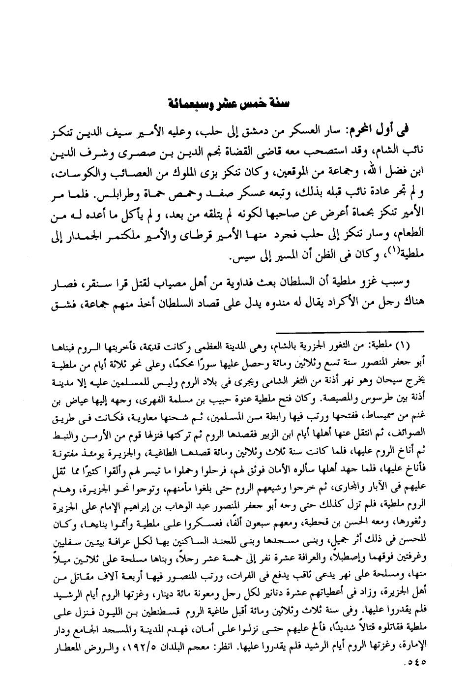 فِي أول الْمحرم: سَار الْعَسْكَر من دمشق إِلَى حلب، وَعَلِيهِ الْأَمِير سيف الدّين تنكز نَائِب الشَّام، وَقد استصحب مَعَه قَاضِي الْقُضَاة نجم الدّين بن صصرى وَشرف الدّين ابْن فضل الله، وَجَمَاعَة من الموقعين، وَكَانَ تنكز بزِي الْمُلُوك من العصائب والكوسات، وَلم تجر عَادَة نَائِب قبله بذلك، وَتَبعهُ عَسْكَر صفد وحمص حماة وطرابلس. فَلَمَّا مر الْأَمِير تنكز بحماة أعرض عَن صَاحبهَا لكَونه لم يتلقه من بعد، وَلم يَأْكُل مَا أعده لَهُ من الطَّعَام، وَسَار تنكز إِلَى حلب فَجرد مِنْهَا الْأَمِير قرطاي والأمير ملكتمر الجمدار إِلَى ملطية، وَكَانَ فِي الظَّن أَن الْمسير إِلَى سيس. وَسبب غَزْو ملطية أَن السُّلْطَان بعث فداوية من أهل مصياب لقتل قرا سنقر، فَصَارَ هُنَاكَ رجل من الأكراد يُقَال لَهُ مندوه يدل على قصاد السُّلْطَان أَخذ مِنْهُم جمَاعَة، فشق
