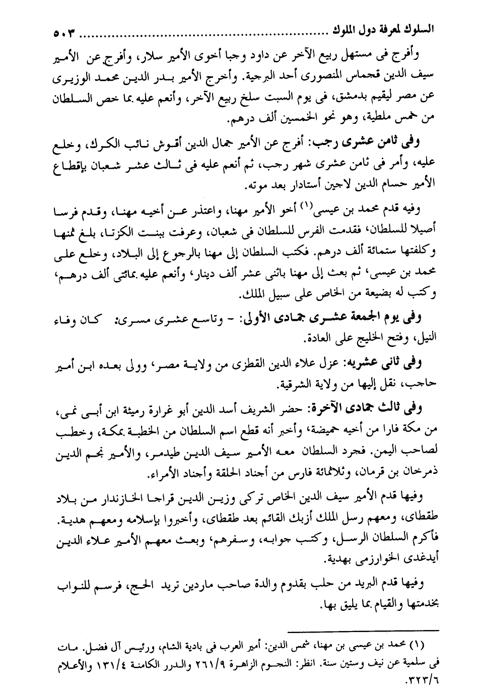 وَأَفْرج فِي مستهل ربيع الآخر عَن دَاوُد وجبا أخوى الْأَمِير سلار، وَأَفْرج عَن الْأَمِير سيف الدّين قجماس المنصوري أحد البرجية. وَأخرج الْأَمِير بدر الدّين مُحَمَّد الوزيري عَن مصر ليقيم بِدِمَشْق، فِي يَوْم السبت سلخ ربيع الآخر، وأنعم عَلَيْهِ بِمَا خص السُّلْطَان من خمس ملطية، وَهُوَ نَحْو الْخمسين ألف دِرْهَم. وَفِي ثامن عشرى رَجَب: أفرج عَن الْأَمِير جمال الدّين أقوش نَائِب الكرك، وخلع عَلَيْهِ، وَأمر فِي ثامن عشرى شهر رَجَب، ثمَّ أنعم عَلَيْهِ فِي ثَالِث عشر شعْبَان بإقطاع الْأَمِير حسام الدّين لاجين أستادار بعد مَوته. وَفِيه قدم مُحَمَّد بن عِيسَى أَخُو الْأَمِير مهنا، وَاعْتذر عَن أَخِيه مهنا، وَقدم فرسا أصيلا للسُّلْطَان، فَقدمت الْفرس للسُّلْطَان فِي شعْبَان، وَعرفت ببنت الكزتا، بلغ ثمنهَا وكلفتها سِتّمائَة ألف دِرْهَم. فَكتب السُّلْطَان إِلَى مهنا بِالرُّجُوعِ إِلَى الْبِلَاد، وخلع على مُحَمَّد بن عِيسَى، ثمَّ بعث إِلَى مهنا بِاثْنَيْ عشر ألف دِينَار، وأنعم عَلَيْهِ بِمِائَتي ألف دِرْهَم، وَكتب لَهُ بضيعة من الْخَاص على سَبِيل الْملك. وَفِي يَوْم الْجُمُعَة عشرى جُمَادَى الأولى: - تَاسِع عشرى مسرى: كَانَ وَفَاء النّيل، وَفتح الخليج على الْعَادة. وَفِي ثامن عشريه: عزل عَلَاء الدّين القطزي من ولَايَة مصر، وَولي بعده ابْن أَمِير حَاجِب، نقل إِلَيْهَا من ولَايَة الشرقية. وَفِي ثَالِث جُمَادَى الْآخِرَة: حضر الشريف أَسد الدّين أَبُو غرارة رميثة ابْن أبي نمى، من مَكَّة فَارًّا من أَخِيه حميضة، وَأخْبر أَنه قطع اسْم السُّلْطَان من الْخطْبَة بِمَكَّة، وخطب لصَاحب الْيمن. فَجرد السُّلْطَان مَعَه الْأَمِير سيف الدّين طيدمر، والأمير نجم الدّين ذمرخان بن قرمان، وثلاثمائة فَارس من أجناد القلعة وأجناد الْأُمَرَاء. وفيهَا قدم الْأَمِير سيف الدّين الْخَاص تركي وزين الدّين قراجا الخازندار من بِلَاد طقطاي، وَمَعَهُمْ رسل الْملك أزبك الْقَائِم بعد طقطاي، وأخبروا بِإِسْلَامِهِ وَمَعَهُمْ هَدِيَّة. فَأكْرم السُّلْطَان الرُّسُل، وَكتب جَوَابه، وسفرهم، وَبعث مَعَهم الْأَمِير عَلَاء الدّين أيدغدي الْخَوَارِزْمِيّ بهدية. وفيهَا قدم الْبَرِيد من حلب بقدوم وَالِدَة صَاحب ماردين تُرِيدُ الْحَج، فرسم للنواب بخدمتها وَالْقِيَام بِمَا يَلِيق بهَا.