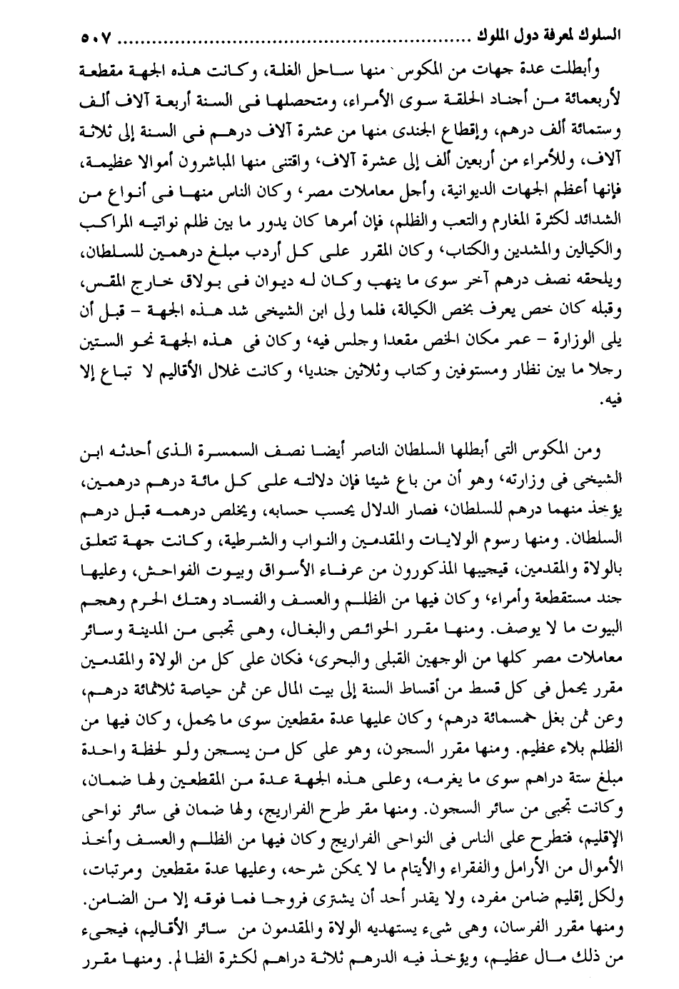 وأبطلت عدَّة جِهَات من المكوس مِنْهَا سَاحل الْغلَّة وَكَانَت هَذِه الْجِهَة مقطعَة لأربعمائة من أجناد الْحلقَة سوى الْأُمَرَاء ومتحصلها فِي السّنة أَرْبَعَة آلَاف ألف وسِتمِائَة ألف دِرْهَم وإقطاع الجندي مِنْهَا من عشرَة آلَاف دِرْهَم فِي السّنة إِلَى ثَلَاثَة آلَاف وللأمراء من أَرْبَعِينَ ألف إِلَى عشرَة آلَاف واقتنى مِنْهَا المباشرون أَمْوَالًا عَظِيمَة فَإِنَّهَا أعظم الْجِهَات الديوانية وَأجل معاملات مصر وَكَانَ النَّاس مِنْهَا فِي أَنْوَاع من الشدائد لِكَثْرَة المغارم والتعب وَالظُّلم فَإِن أمرهَا كَانَ يَدُور مَا بَين ظلم نواتيه المراكب والكيالين والمشدين وَالْكتاب وَكَانَ الْمُقَرّر على كل أردب مبلغ دِرْهَمَيْنِ للسُّلْطَان ويلحقه نصف دِرْهَم أخر سوى مَا ينهب وَكَانَ لَهُ ديوَان فِي بولاق خَارج المقس وَقَبله كَانَ خص يعرف بخص الكيالة فَلَمَّا ولى ابْن الشيخي شدّ هَذِه الْجِهَة - قبل أَن يَلِي الوزارة - عمر مَكَان الخص مقْعدا وَجلسَ فِيهِ وَكَانَ فِي هَذِه الْجِهَة نَحْو السِّتين رجلا مَا بَين نظار ومستوفين وَكتاب وَثَلَاثِينَ جندياً وَكَانَت غلال الأقاليم لَا تبَاع إِلَّا فِيهِ. وَمن المكوس الَّتِي أبطلها السُّلْطَان النَّاصِر أَيْضا نصف السمسرة الَّذِي أحدثه ابْن الشيخي فِي وزارته وَهُوَ أَن من بَاعَ شَيْئا فَإِن دلَالَته على كل مائَة دِرْهَم دِرْهَمَيْنِ يُؤْخَذ مِنْهُمَا دِرْهَم للسُّلْطَان فَصَارَ الدَّلال يحْسب حسابه ويخلص درهمه قبل دِرْهَم السُّلْطَان. وَمِنْهَا رسوم الولايات والمقدمين والنواب والشرطية وَكَانَت جِهَة تتَعَلَّق بالولاة والمقدمين فيجيبها المذكورون من عرفاء الْأَسْوَاق وبيوت الْفَوَاحِش وَعَلَيْهَا جند مستقطعة وأمراء وَكَانَ فِيهَا من الظُّلم والعسف وَالْفساد وهتك الْحرم وهجم الْبيُوت مَا لَا يُوصف. وَمِنْهَا مُقَرر الحوائص وَالْبِغَال وَهِي تجبى من الْمَدِينَة وَسَائِر معاملات مصر كلهَا من الْوَجْهَيْنِ القبلي والبحري فَكَانَ على كل من الْوُلَاة والمقدمين مُقَرر يحمل فِي كل قسط من أًقساط السّنة إِلَى بَيت المَال عَن ثمن حياصة ثَلَاثمِائَة دِرْهَم وَعَن ثمن بغل خَمْسمِائَة دِرْهَم وَكَانَ عَلَيْهَا عدَّة مقطعين سوى مَا يحمل وَكَانَ فِيهَا من الظُّلم بلَاء عَظِيم. وَمِنْهَا مُقَرر السجون وَهُوَ على كل من يسجن وَلَو لَحْظَة وَاحِدَة مبلغ سِتَّة دَرَاهِم سوى مَا يغرمه وعَلى هَذِه الْجِهَة عدَّة من المقطعين وَلها ضَمَان وَكَانَت تجبى من سَائِر السجون. وَمِنْهَا مقرّ طرح الفراريج وَلها ضَمَان فِي سَائِر نواحي الإقليم فتطرح على النَّاس فِي النواحي الفراريج وَكَانَ فِيهَا من الظُّلم والعسف وَأخذ الْأَمْوَال من الأرامل والفقراء والأيتام مَا لَا يُمكن شَرحه وَعَلَيْهَا عدَّة مقطعين ومرتبات وَلكُل إقليم ضَامِن مُفْرد وَلَا يقدر أحد أَن يَشْتَرِي فروجاً فَمَا فَوْقه إِلَّا من الضَّامِن. وَمِنْهَا مُقَرر الفرسان وَهِي شَيْء يستهديه الْوُلَاة والمقدمون من سَائِر الأقاليم فَيَجِيء من ذَلِك مَال عَظِيم وَيُؤْخَذ فِيهِ الدِّرْهَم ثَلَاثَة دَرَاهِم لِكَثْرَة الظَّالِم. وَمِنْهَا مُقَرر
