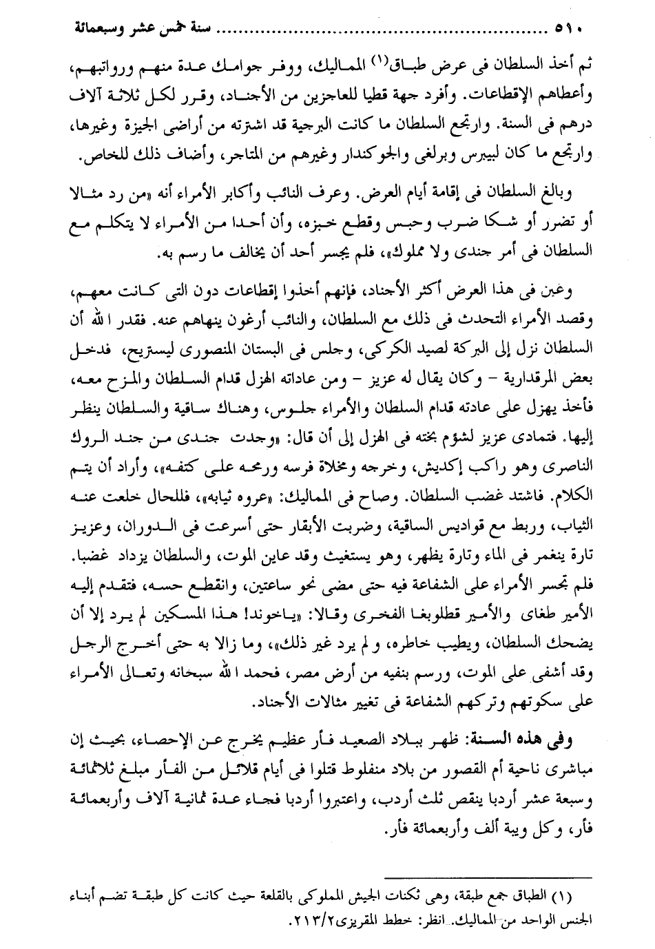 ثمَّ أَخذ السُّلْطَان فِي عرض طباق المماليك ووفر جوامك عدَّة مِنْهُم ورواتبهم وَأَعْطَاهُمْ الإقطاعات. وأفرد جِهَة قطيا للعاجزين من الأجناد وَقرر لكل ثَلَاثَة آلَاف دِرْهَم فِي السّنة. وارتجع السُّلْطَان مَا كَانَت البرجية قد اشترته من أَرَاضِي الجيزة وَغَيرهَا وارتجع مَا كَانَ لبيبرس وبرلغي والجوكندار وَغَيرهم من المتاجر وأضاف ذَلِك للخاص. وَبَالغ السُّلْطَان فِي إِقَامَة أَيَّام الْعرض. وَعرف النَّائِب وأكابر الْأُمَرَاء أَنه من رد مِثَالا أَو تضرر أَو شكا ضرب وَحبس وَقطع خبزه وَأَن أحدا من الْأُمَرَاء لَا يتَكَلَّم مَعَ السُّلْطَان فِي أَمر جندي وَلَا مَمْلُوك فَلم يَجْسُر أحد أَن يُخَالف مَا رسم بِهِ. وَعين فِي هَذَا الْعرض أَكثر الأجناد فَإِنَّهُم أخذُوا إقطاعات دون الَّتِي كَانَت مَعَهم وَقصد الْأُمَرَاء التحدث فِي ذَلِك مَعَ السُّلْطَان والنائب أرغون ينهاهم عَنهُ. فَقدر الله أَن السُّلْطَان نزل إِلَى الْبركَة لصيد الكركي وَجلسَ فِي الْبُسْتَان المنصوري ليستريح فَدخل بعض المرقدارية - وَكَانَ يُقَال لَهُ عَزِيز - وَمن عاداته الْهزْل قُدَّام السُّلْطَان والمزح مَعَه فَأخذ يهزل على عَادَته قُدَّام السُّلْطَان والأمراء جُلُوس وَهُنَاكَ ساقية وَالسُّلْطَان ينظر إِلَيْهَا. فتمادى عَزِيز لشؤم بخته فِي الْهزْل إِلَى أَن قَالَ: وجدت جندي من جند الروك الناصري وَهُوَ رَاكب إكديش وخرجه ومخلاة فرسه وَرمحه على كتفه وَأَرَادَ أَن يتم الْكَلَام. فَاشْتَدَّ غضب السُّلْطَان. وَصَاح فِي المماليك. عروه ثِيَابه فللحال خلعت عَنهُ الثِّيَاب وربط مَعَ قواديس الساقية وَضربت الأبقار حَتَّى أسرعت فِي الدوران وعزيز تَارَة ينغمر فِي المَاء وَتارَة يظْهر وَهُوَ يستغيث وَقد عاين الْمَوْت وَالسُّلْطَان يزْدَاد غَضبا. فَلم تجسر الْأُمَرَاء على الشَّفَاعَة فِيهِ حَتَّى مضى نَحْو ساعتين وَانْقطع حسه فَتقدم إِلَيْهِ الْأَمِير طغاي والأمير قطلوبغا الفخري وَقَالا: ياخوند! هَذَا الْمِسْكِين لم يرد إِلَّا أَن يضْحك السُّلْطَان ويطيب خاطره وَلم يرد غير ذَلِك وَمَا زَالا بِهِ حَتَّى أخرج الرجل وَقد أشفى على الْمَوْت ورسم بنفيه من أَرض مصر فَحَمدَ الله سُبْحَانَهُ وَتَعَالَى الْأُمَرَاء على سكوتهم وتركهم الشَّفَاعَة فِي تَغْيِير مثالات الأجناد وَفِي هده السّنة: ظهر بِبِلَاد الصَّعِيد فأر عَظِيم يخرج عَن الإحصاء بِحَيْثُ إِن مباشري نَاحيَة أم الْقُصُور من بِلَاد منفلوط قتلوا فِي أَيَّام قَلَائِل من الفأر مبلغ ثَلَاثمِائَة وَسَبْعَة عشر أردباً ينقص ثلث أردب واعتبروا أردباً فجَاء عدَّة ثَمَانِيَة آلَاف وَأَرْبَعمِائَة فأر وكل ويبة ألف وَأَرْبَعمِائَة فأر