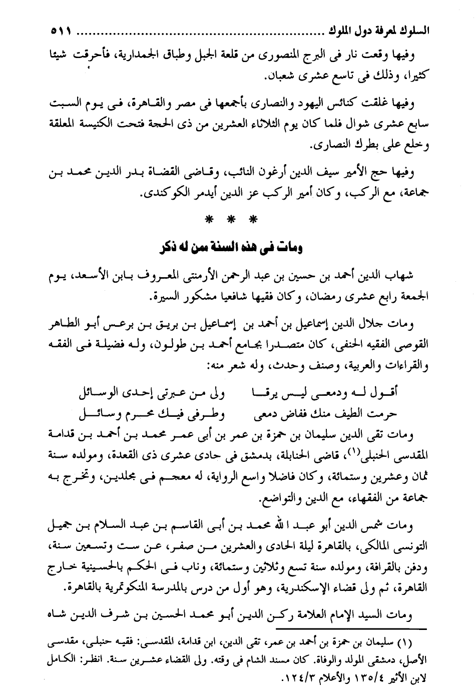 وفيهَا وَقعت نَار فِي البرج المنصوري من قلعة الْجَبَل وطباق الجمدارية فأحرقت شَيْئا كثيرا وَذَلِكَ فِي تَاسِع عشرى شعْبَان. وفيهَا غلقت كنائس الْيَهُود وَالنَّصَارَى بأجمعها فِي مصر والقاهرة فِي يَوْم السبت سَابِع عشرى شَوَّال فَلَمَّا كَانَ يَوْم الثُّلَاثَاء الْعشْرين من ذِي الْحجَّة فتحت الْكَنِيسَة الْمُعَلقَة وخلع على بطرك النَّصَارَى. وفيهَا حج الْأَمِير سيف الدّين أرغون النَّائِب وقاضي الْقُضَاة بدر الدّين مُحَمَّد بن جمَاعَة مَعَ الركب وَكَانَ أَمِير الركب عز الدّين أيدمر الكوكندي. وَمَات فِي هَذِه السّنة مِمَّن لَهُ ذكر شهَاب الدّين أَحْمد بن حُسَيْن بن عبد الرَّحْمَن الأرمنتي الْمَعْرُوف بِابْن الأسعد يَوْم الْجُمُعَة رَابِع عشرى رَمَضَان وَكَانَ فَقِيها شافعياً مشكور السِّيرَة. وَمَات جلال الدّين إِسْمَاعِيل بن أَحْمد بن إِسْمَاعِيل بن بريق بن برعس أَبُو الطَّاهِر القوصي الْفَقِيه الْحَنَفِيّ كَانَ متصدراً بِجَامِع أَحْمد بن طولون وَله فَضِيلَة فِي الْفِقْه والقراءات والعربية وصنف وَحدث وَله شعر مِنْهُ: حرمت الطيف مِنْك فَفَاضَ دمعي وطرفي فِيك محرم وَسَائِل وَمَات تَقِيّ الدّين سُلَيْمَان بن حَمْزَة بن عمر بن أبي عمر مُحَمَّد بن أَحْمد بن قدامَة الْمَقْدِسِي الْحَنْبَلِيّ قَاضِي الْحَنَابِلَة بِدِمَشْق فِي حادي عشرى ذِي الْقعدَة ومولده سنة ثَمَان وَعشْرين وسِتمِائَة وَكَانَ فَاضلا وَاسع الرِّوَايَة لَهُ مُعْجم فِي مجلدين وَتخرج بِهِ جمَاعَة من الْفُقَهَاء مَعَ الدّين والتواضع. وَمَات شمس الدّين أَبُو عبد الله مُحَمَّد بن أبي الْقَاسِم بن عبد السَّلَام بن جميل التّونسِيّ الْمَالِكِي بِالْقَاهِرَةِ لَيْلَة الْحَادِي وَالْعِشْرين من صفر عَن سِتّ وَتِسْعين سنة ودفق بالقرافة ومولده سنة تسع وَثَلَاثِينَ وسِتمِائَة وناب فِي الحكم بالحسينية خَارج الْقَاهِرَة ثمَّ ولي قَضَاء الْإسْكَنْدَريَّة وَهُوَ أول من درس بِالْمَدْرَسَةِ المنكوتمرية بِالْقَاهِرَةِ. وَمَات السَّيِّد الإِمَام الْعَلامَة ركن الدّين أَبُو مُحَمَّد الْحُسَيْن بن شرف الدّين شاه