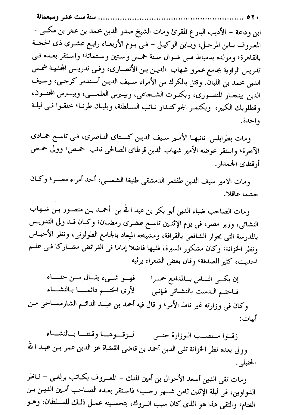 ابْن ودَاعَة - الأديب البارع الْمُقْرِئ وَمَات الشَّيْخ صدر الدّين مُحَمَّد بن عمر بن مكي - الْمَعْرُوف بِابْن المرحل وبابن الْوَكِيل - فِي يَوْم الْأَرْبَعَاء رَابِع عشرى ذِي الْحجَّة بِالْقَاهِرَةِ ومولده بدمياط فِي شَوَّال سنة خمس وَسِتِّينَ وسِتمِائَة وَاسْتقر بعده فِي تدريس الزاوية بِجَامِع عَمْرو شهَاب الدّين بن الْأنْصَارِيّ وَفِي تدريس المجدية شمس الدّين مُحَمَّد بن اللبان. وَقتل بالكرك من الْأُمَرَاء سيف الدّين أسندمر كرجي وَسيف الدّين بينجار المنصوري وبكتوت الشجاعي وبيبرس العلمي وبيبرس الْمَجْنُون وقطلوبك الْكَبِير وبكتمر الجوكندار نَائِب السلطنة وبلبان طرنا خنقوا فِي لَيْلَة وَاحِدَة. وَمَات بطرابلس نائبها الْأَمِير سيف الدّين كستاي الناصري فِي تَاسِع جُمَادَى الْآخِرَة وَاسْتقر عوضه الْأَمِير شهَاب الدّين قرطاي الصَّالِحِي نَائِب حمص وَولي حمص أرقطاي الجمدار. وَمَات الْأَمِير سيف الدّين طقتمر الدِّمَشْقِي طنبغا الشمسي أحد أُمَرَاء مصر وَكَانَ حشماً عَاقِلا. وَمَات الصاحب ضِيَاء الدّين أَبُو بكر بن عبد الله بن أَحْمد بن مَنْصُور بن شهَاب النشائي وَزِير مصر فِي يَوْم الْإِثْنَيْنِ تَاسِع عشرى رَمَضَان وَكَانَ قد ولي التدريس بِالْمَدْرَسَةِ الَّتِي بجوار الشَّافِعِي بالقرافة ومشيخه الميعاد بالجامع الطولوني وَنظر الأحباس وَنظر الخزانة وَكَانَ مشكور السِّيرَة فَقِيها فَاضلا إِمَامًا فِي الْفَرَائِض مشاركاً فِي علم الحَدِيث كثير الصَّدَقَة وَقَالَ بعض الشُّعَرَاء يرثيه: إِن بَكَى النَّاس بالمدامع حمرا فَهُوَ شَيْء يُقَال من حناء فاختم الدست بالنشائي فَإِنِّي لأرى الْخَتْم دَائِما بالنشاء وَكَانَ فِي وزارته غير نَافِذ الْأَمر وَقَالَ فِيهِ أَحْمد بن عبد الدَّائِم الشارمساحي من أَبْيَات: زقوا منصب الوزارة حَتَّى لزقوها وقتنا بالنشاء وَولي بعده نظر الخزانة تَقِيّ الدّين أَحْمد بن قَاضِي الْقُضَاة عز الدّين عمر بن عبد الله الْحَنْبَلِيّ. وَمَات تَقِيّ الدّين أسعد الْأَحْوَال بن أَمِين الْملك - الْمَعْرُوف بكاتب برلغي - نَاظر الدَّوَاوِين فِي لَيْلَة الْإِثْنَيْنِ ثامن شهر رَجَب فاستقر بعده الصاحب أَمِين الدّين بن الغنام والتقى هَذَا هُوَ الَّذِي كَانَ سَبَب الروك بتحسينه عمل ذَلِك للسُّلْطَان وَهُوَ