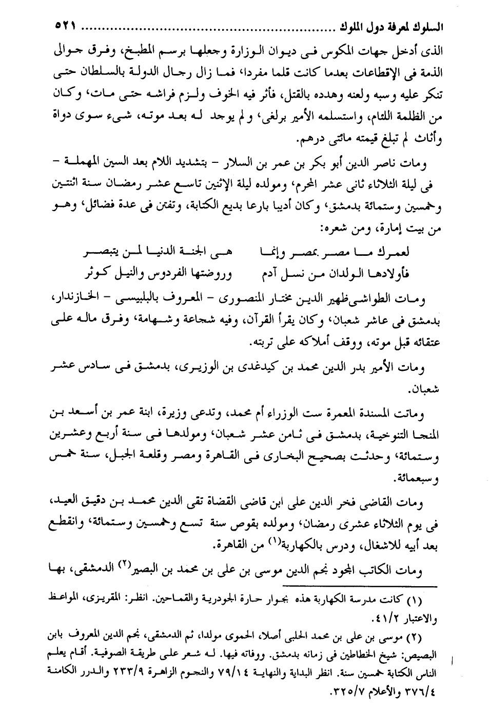 الَّذِي أَدخل جِهَات المكوس فِي ديوَان الوزارة وَجعلهَا برسم المطبخ وَفرق جوالي الذِّمَّة فِي الإقطاعات بَعْدَمَا كَانَت قَلما مُفردا فَمَا زَالَ رجال الدولة بالسلطان حَتَّى تنكر عَلَيْهِ وسبه ولعنه وهدده بِالْقَتْلِ فأثر فِيهِ الْخَوْف وَلزِمَ فرَاشه حَتَّى مَاتَ وَكَانَ من الظلمَة اللئام واستسلمه الْأَمِير برلغي وَلم يُوجد لَهُ بعد مَوته شَيْء سوى دَوَاة وأثاث لم تبلغ قِيمَته مِائَتي دِرْهَم. وَمَات نَاصِر الدّين أَبُو بكر بن عمر بن السلار - بتَشْديد اللَّام بعد السِّين الْمُهْملَة - فِي لَيْلَة الثُّلَاثَاء ثَانِي عشر الْمحرم ومولده لَيْلَة الِاثْنَيْنِ تَاسِع عشر رَمَضَان سنة اثْنَتَيْنِ وَخمسين وسِتمِائَة بِدِمَشْق وَكَانَ أديباً بارعاً بديع الْكِتَابَة وتفتن فِي عدَّة فَضَائِل وَهُوَ من بَيت إِمَارَة وَمن شعره: لعمرك مَا مصر بِمصْر وَإِنَّمَا هِيَ الْجنَّة الدُّنْيَا لمن يتبصر فأولادها الْوَالِدَان من نسل آدم وروضتها الفردوس والنيل كوثر وَمَات الطواشي ظهير الدّين مُخْتَار المنصوري - الْمَعْرُوف بالبلبيسي - الخازندار بِدِمَشْق فِي عَاشر شعْبَان وَكَانَ يقراً الْقُرْآن وَفِيه شجاعة وشهامة وَفرق مَاله على عتقائه قبل مَوته ووقف أملاكه على تربته. وَمَات الْأَمِير بدر الدّين مُحَمَّد بن كيدغدي بن الوزيري بِدِمَشْق فِي سادس عشر شعْبَان. وَمَاتَتْ المسندة المعمرة سِتّ الوزراء أم مُحَمَّد وتدعى وزيرة ابْنة عمر بن أسعد بن المنجا التنوخية بِدِمَشْق فِي ثامن عشر شعْبَان ومولدها فِي سنة أَربع وَعشْرين وسِتمِائَة وَحدثت بِصَحِيح البُخَارِيّ فِي الْقَاهِرَة ومصر وقلعة الْجَبَل سنة خمس وَسَبْعمائة. وَمَات القَاضِي فَخر الدّين عَليّ ابْن قَاضِي الْقُضَاة تَقِيّ الدّين مُحَمَّد بن دَقِيق الْعِيد فِي يَوْم الثُّلَاثَاء عشرى رَمَضَان. ومولده بقوص سنة تسع وَخمسين وسِتمِائَة وَانْقطع بعد أَبِيه للأشغال ودرس بالكهاربة من الْقَاهِرَة. وَمَات الْكَاتِب المجود نجم الدّين مُوسَى بن على بن مُحَمَّد بن الْبَصِير الدِّمَشْقِي بهَا