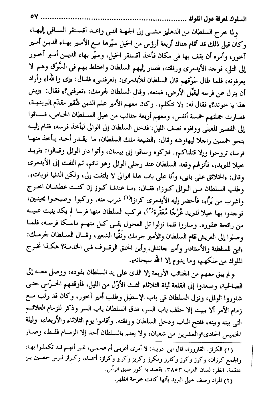 وَلما خرج السُّلْطَان من الدهليز مشي إِلَى الْجِهَة الَّتِي وَاعد آقسنقر الساقي إِلَيْهَا وَكَانَ قبل ذَلِك قد أَقَامَ هُنَاكَ أَرْبَعَة أرؤس من الْخَيل سَيرهَا مَعَ الْأَمِير بهاء الدّين أَمِير أخور وَأمره أَن يقف بهَا فِي مَكَان فَأخذ أقسنقر الْخَيل وسير بهاء الدّين أَمِير آخور إِلَى التل فَوجدَ الأيدمري ورفقته فَصَارَ إِلَيْهِم السُّلْطَان وَاخْتَلَطَ بهم فِي السُّوق وهم لَا يعرفونه فَلَمَّا طَال سوقهم قَالَ السُّلْطَان للأيدمري: تعرفنِي فَقَالَ: إِي وَالله وَأَرَادَ أَن ينزل عَن فرسه ليقبل الأَرْض فَمَنعه. وَقَالَ السُّلْطَان لجرمك: تعرفنِي فَقَالَ: إيش هَذَا يَا خوند فَقَالَ لَهُ: لَا تَتَكَلَّم. وَكَانَ مَعَهم الْأَمِير علم الدّين شقير مقدم البريدية فَصَارَت جُمْلَتهمْ خَمْسَة أنفس وَمَعَهُمْ أَرْبَعَة جنائب من خيل السُّلْطَان الْخَاص فساقوا إِلَى الْقصير المعيني ووافوه نصف اللَّيْل فَدخل السُّلْطَان إِلَى الْوَالِي ليَأْخُذ فرسه فَقَامَ إِلَيْهِ بِنَحْوِ خمسين رَاجِلا إِلَيْهَا وَقَالَ: الضَّيْعَة ملك السُّلْطَان مَا يقدر أحد يَأْخُذ مِنْهَا فرسا تروحوا وَإِلَّا قتلناكم. فَتَرَكُوهُ وَسَاقُوا إِلَى بيسان وَأتوا دَار الْوَالِي وَقَالُوا: نُرِيد خيلا للبريد فأنزلهم وَقعد السُّلْطَان عِنْد رجْلي الْوَالِي وَهُوَ نَائِم ثمَّ الْتفت إِلَى الأيدمري وَقَالَ: الْخَلَائق على بَابي وَأَنا على هَذَا الْوَالِي لَا يلْتَفت إِلَيّ وَلَكِن الدُّنْيَا نوبات. وَطلب السُّلْطَان من الْوَالِي كوزا فَقَالَ: مَا عندنَا كوز إِن كنت عطشان أخرج واشرب من برا فأحضر إِلَيْهِ الأيدمري كرازا شرب مِنْهُ. وركبوا وصبحوا بجينين فوجدوا بهَا خيلا للبريد عرجا معقرة فَركب السُّلْطَان مِنْهَا فرسا لم يكد يثبت عَلَيْهِ من رَائِحَة عقوره. وَسَارُوا فَلَمَّا نزلُوا تل العجول بَقِي كل مِنْهُم ماسكا فرسه فَلَمَّا وصلوا إِلَى الْعَريش قَامَ السُّلْطَان والأمير جرمك ونقيا الشّعير وَقَالَ السُّلْطَان لجرمك: ابْن السلطة والأستادار وأمير جاندار وَأَيْنَ الْخلق الْوُقُوف فِي الْخدمَة هَكَذَا تخرج الْمُلُوك من ملكهم وَمَا يَدُوم إِلَّا الله سُبْحَانَهُ. وَلم يبْق مَعَهم من الجنائب الْأَرْبَعَة إِلَّا الَّذِي على يَد السُّلْطَان يَقُودهُ وَوصل مَعَه إِلَى الصالحية وصعدوا إِلَى القلعة لَيْلَة الثُّلَاثَاء الثُّلُث الأول من اللَّيْل فأوقفهم الحراس حَتَّى شاوروا الْوَالِي وَنزل السُّلْطَان فِي بَاب الإسطبل وَطلب أَمِير آخور وَكَانَ قد رتب مَعَ زِمَام الْأَمر أَلا يبيت إِلَّا خلف بَاب السِّرّ فدق السُّلْطَان بَاب السِّرّ وَذكر للزمام العلائم الَّتِي بَينه وَبَينه فَفتح الْبَاب وَدخل السُّلْطَان ورفقته. وَأَقَامُوا يَوْم الثُّلَاثَاء وَالْأَرْبِعَاء وَلَيْلَة الْخَمِيس الْحَادِي وَالْعِشْرين من شعْبَان وَلَا يعلم بالسلطان أحد إِلَّا الزِّمَام فَقَط وَصَارَ