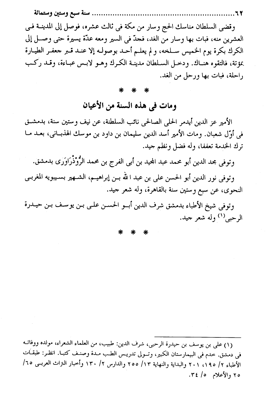 وَقضي السُّلْطَان مَنَاسِك الْحَج وَسَار من مَكَّة فِي ثَالِث عشره فوصل إِلَى الْمَدِينَة فِي الْعشْرين مِنْهُ فَبَاتَ بهَا وَسَار من الْغَد فجد فِي السّير وَمَعَهُ عدَّة يسيرَة حَتَّى وصل إِلَى الكرك بكرَة يَوْم الْخَمِيس سلخه وَلم يعلم أحد بوصوله إِلَّا عِنْد قبر جَعْفَر الطيارة بمؤتة فالتقوه هُنَاكَ. وَدخل السُّلْطَان مَدِينَة الكرك وَهُوَ لابس عباءة وَقد ركب رَاحِلَة فَبَاتَ بهَا ورحل من الْغَد. وَمَات فِي هَذِه السّنة من الْأَعْيَان الْأَمِير عز الدّين أيدمر الْحلِيّ الصَّالِحِي نَائِب السلطنة عَن نَيف وَسِتِّينَ سنة بِدِمَشْق فِي أول شعْبَان. وَمَات الْأَمِير أَسد الدّين سُلَيْمَان بن دَاوُد بن موسك الهذباني بعد مَا ترك الْخدمَة تعففا وَله فضل ونظم جيد. وَتُوفِّي مجد الدّين أَبُو مُحَمَّد عبد الْمجِيد بن أبي الْفرج بن مُحَمَّد الروذراوري بِدِمَشْق. وَتُوفِّي نور الدّين أَبُو الْحسن على بن عبد الله بن إِبْرَاهِيم الشهير بسيبويه المغربي النَّحْوِيّ عَن سبع وَسِتِّينَ وَتُوفِّي شيخ الْأَطِبَّاء بِدِمَشْق شرف الدّين أَبُو الْحسن على بن يُوسُف بن حيدرة الرَّحبِي وَله شعر جيد.