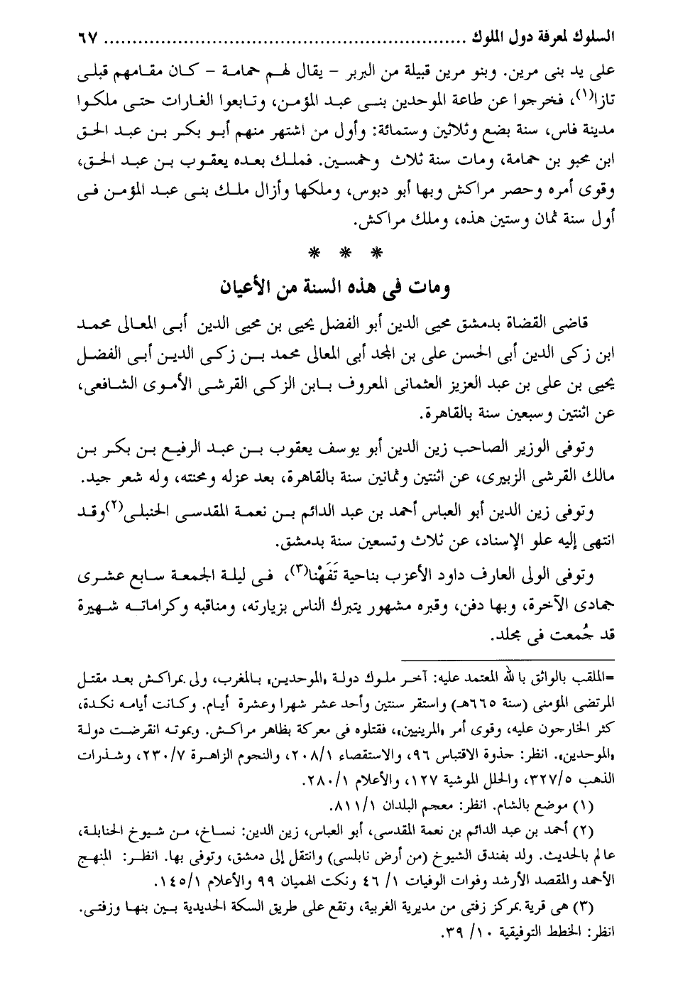 على يَد بني مرين. وَبَنُو مرين قَبيلَة من البربر يُقَال لَهُم حمامة كَانَ مقامهم قبلي تازا فَخَرجُوا عَن طَاعَة الْمُوَحِّدين بني عبد الْمُؤمن وتابعوا الغارات حَتَّى ملكوا مَدِينَة فاس سنة بضع وَثَلَاثِينَ وسِتمِائَة: وَأول من اشْتهر مِنْهُم أَبُو بكر بن عبد الْحق ابْن محبو بن حمامة وَمَات سنة ثَلَاث وَخمسين. فَملك بعده يَعْقُوب بن عبد الْحق وَقَوي أمره وَحصر مراكش وَبهَا أَبُو دبوس وملكها وأزال ملك بني عبد الْمُؤمن فِي أول وَمَات فِي هَذِه السّنة من الْأَعْيَان قَاضِي الْقُضَاة بِدِمَشْق محيي الدّين أَبُو الْفضل يحيي بن محيي الدّين أبي الْمَعَالِي مُحَمَّد ابْن زكي الدّين أبي الْحسن على بن الْمجد أبي الْمَعَالِي مُحَمَّد بن زكي الدّين أبي الْفضل يحيى بن على بن عبد الْعَزِيز العثماني الْمَعْرُوف بِابْن الزكي الْقرشِي الْأمَوِي الشَّافِعِي عَن اثْنَتَيْنِ وَسبعين سنة بِالْقَاهِرَةِ. وَتُوفِّي الْوَزير الصاحب زين الدّين أَبُو يُوسُف يَعْقُوب بن عبد الرفيع بن بكر بن مَالك الْقرشِي الزبيرِي عَن اثْنَتَيْنِ وَثَمَانِينَ سنة بِالْقَاهِرَةِ بعد عَزله ومحنته وَله شعر جيد. وَتُوفِّي زين الدّين أَبُو الْعَبَّاس أَحْمد بن عبد الدَّائِم بن نعدة الْمَقْدِسِي الْحَنْبَلِيّ وَقد انتهي إِلَيْهِ علو الْإِسْنَاد عَن ثَلَاث وَتِسْعين سنة بِدِمَشْق. وَتُوفِّي الْوَلِيّ الْعَارِف دَاوُد الأعزب بِنَاحِيَة تفهنا فِي لَيْلَة الْجُمُعَة سَابِع عشرى جُمَادَى الْآخِرَة وَبهَا دفن وقبره مَشْهُور يتبرك النَّاس بزيارته ومناقبه وكراماته شهيرة قد جمعت فِي مُجَلد.
