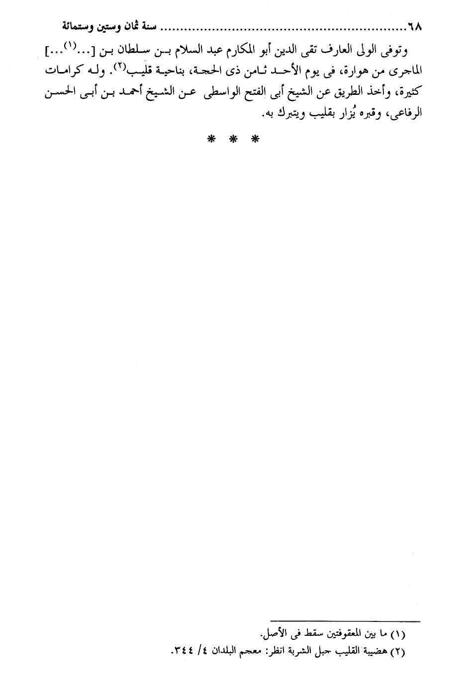 وَتُوفِّي الْوَلِيّ الْعَارِف تَقِيّ الدّين أَبُو المكارم عبد السَّلَام بن سُلْطَان بن الماجري من هوارة فِي يَوْم الْأَحَد ثامن ذِي الْحجَّة بِنَاحِيَة قليب. وَله كرامات كَثِيرَة وَأخذ الطَّرِيق عَن الشَّيْخ أبي الْفَتْح الوَاسِطِيّ عَن الشَّيْخ أَحْمد بن أبي الْحسن الرِّفَاعِي، وقبره يزار بقليب ويتبرك بِهِ.