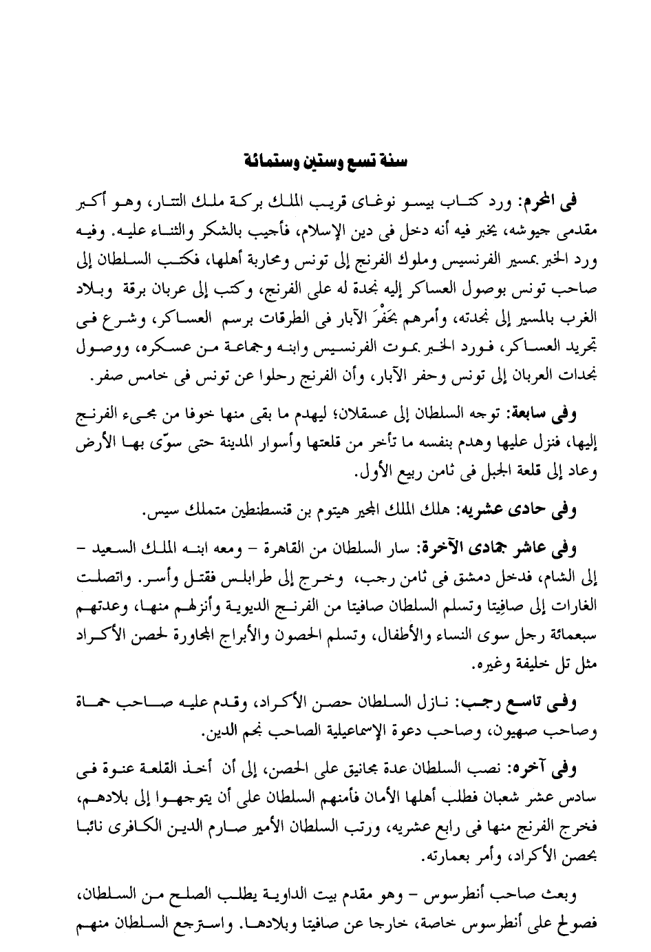 فِي الْمحرم: ورد كتاب بيسو نوغاي قريب الْملك بركَة ملك التتار وَهُوَ أكبر مقدمي جيوشه يخبر فِيهِ أَنه دخل فِي دين الْإِسْلَام فَأُجِيب بالشكر وَالثنَاء عَلَيْهِ. وَفِيه ورد الْخَبَر. بمسير الفرنسيس وملوك الفرنج إِلَى تونس ومحاربة أَهلهَا فَكتب السُّلْطَان إِلَى صَاحب تونس بوصول العساكر إِلَيْهِ نجدة لَهُ على الفرنج وَكتب إِلَى عربان برقة وبلاد الغرب بِالْمَسِيرِ إِلَى نجدته وَأمرهمْ بِحَفر الْآبَار فِي الطرقات برسم العساكر وَشرع فِي تَجْرِيد العساكر فورد الْخَبَر. بِمَوْت الفرنسيس وَابْنه وَجَمَاعَة من عسكره ووصول نجدات العربان إِلَى تونس وحفر الْآبَار وَأَن الفرنج رحلوا عَن تونس فِي خَامِس صفر. وَفِي سابعة: توجه السُّلْطَان إِلَى عسقلان ليهْدم مَا بَقِي مِنْهَا خوفًا من مَجِيء الفرنج إِلَيْهَا فَنزل عَلَيْهَا وَهدم بِنَفسِهِ مَا تَأَخّر من قلعتها وأسوار الْمَدِينَة حَتَّى سوي بهَا الأَرْض وَعَاد إِلَى قلعة الْجَبَل فِي ثامن ربيع الأول. وَفِي حادي عشريه: هلك الْملك المجير هيتوم بن قنسطنطين متملك سيس. وَفِي عَاشر جُمَادَى الْآخِرَة. سَار السُّلْطَان من الْقَاهِرَة وَمَعَهُ ابْنه الْملك السعيد إِلَى الشَّام فَدخل دمشق فِي ثامن رَجَب وَخرج إِلَى طرابلس فَقتل وَأسر. واتصلت الغارات إِلَى صافيتا وتسلم السُّلْطَان صافيتا من الفرنج الديوية وأنزلهم مِنْهَا وعدتهم سَبْعمِائة رجل سوي النِّسَاء والأطفال وتسلم الْحُصُون والأبراج الْمُجَاورَة لحصن الأكراد مثل تل خَليفَة وَغَيره. وَفِي تَاسِع رَجَب: نَازل السُّلْطَان حصن الأكراد وَقدم عَلَيْهِ صَاحب حماة وَصَاحب صهيون وَصَاحب دَعْوَة الإسماعيلية الصاحب نجم الدّين. وَفِي آخِره: نصب السُّلْطَان عدَّة مجانيق على الْحصن إِلَى أَن أَخذ القلعة عنْوَة فِي سادس عشر شعْبَان فَطلب أَهلهَا الْأمان فَأَمنَهُمْ السُّلْطَان على أَن يتوجهوا إِلَى بِلَادهمْ فَخرج الفرنج مِنْهَا فِي رَابِع عشريه ورتب السُّلْطَان الْأَمِير صارم الدّين الكافري نَائِبا بحصن الأكراد وَأمر بعمارته. وَبعث صَاحب أنطرسوس وَهُوَ مقدم بَيت الداوية يطْلب الصُّلْح من السُّلْطَان فصولح على أنطرسوس خَاصَّة خَارِجا عَن صافيتا وبلادها. واسترجع السُّلْطَان مِنْهُم
