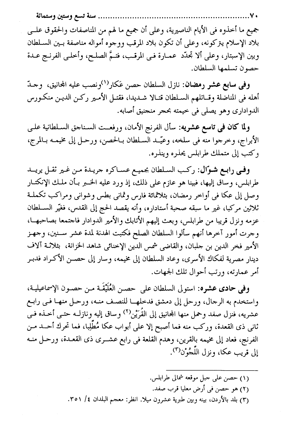 جَمِيع مَا أَخَذُوهُ فِي الْأَيَّام الناصيرية وعَلى أَن جَمِيع مَا لَهُم من المناصفات والحقوق على بِلَاد الْإِسْلَام يتركونه وعَلى أَن تكون بِلَاد المرقب ووجوه أَمْوَاله مُنَاصَفَة بَين السُّلْطَان وَبَين الإسبتار وعَلى أَلا تجدّد عمَارَة فِي المرقب فتم الصُّلْح وأخلي الفرنج عدَّة حصون تسلمها السُّلْطَان. وَفِي سَابِع عشر رَمَضَان: نَازل السُّلْطَان حصن عكار وَنصب عَلَيْهِ المجانيق وجد أَهله فِي المناضلة وَقَاتلهمْ السُّلْطَان قتالا شَدِيدا فَقتل الْأَمِير ركن الدّين منكورس الدواداري وَهُوَ يُصَلِّي فِي خيمته بِحجر منجنيق أَصَابَهُ. وَلما كَانَ فِي تَاسِع عشريه: سَأَلَ الفرنج الْأمان وَرفعت السناجق السُّلْطَانِيَّة على الأبراج وَخَرجُوا مِنْهُ فِي سلخه وَعِيد السُّلْطَان بالحصن ورحل إِلَى مخيمه بالمرج وَكتب إِلَى متملك طرابلس يحذرهُ وينذره. وَفِي رَابِع شَوَّال: ركب السُّلْطَان بِجَمِيعِ عساكره جَرِيدَة من غير ثقل يُرِيد طرابلس وسَاق إِلَيْهَا فَبينا هُوَ عازم على ذَلِك إِذْ ورد عَلَيْهِ الْخَبَر بِأَن ملك الإنكتار وصل إِلَى عكا فِي أَوَاخِر رَمَضَان بثلاثمائة فَارس وثماني بطس وشواني ومراكب تَكْمِلَة ثَلَاثِينَ مركبا غير مَا سبقه صُحْبَة أستاداره وَإنَّهُ يقْصد الْحَج إِلَى الْقُدس فَغير السُّلْطَان عزمه وَنزل قَرِيبا من طرابلس وَبعث إِلَيْهِم الأتابك والأمير الدوادار فاجتمعا بصاحبها وَجَرت أُمُور آخرهَا إِنَّهُم سَأَلُوا السُّلْطَان الصُّلْح فَكتبت الْهُدْنَة لمُدَّة عشر سِنِين وجهز الْأَمِير فَخر الدّين بن جلبان وَالْقَاضِي شمس الدّين الإخنائي شَاهد الخزانة بِثَلَاثَة آلَاف دِينَار مصرية لفكاك الأسري وَعَاد السُّلْطَان إِلَى مخيمه وَسَار إِلَى حصن الأكراد فدبر أَمر عِمَارَته ورتب أَحْوَال تِلْكَ الْجِهَات. وَفِي حادي عشره: استولي السُّلْطَان على حصن العليقة من حصون الإسماعيلية واستخدم بِهِ الرِّجَال ورحل إِلَى دمشق فَدَخلَهَا لِلنِّصْفِ مِنْهُ ورحل مِنْهَا فِي رَابِع عشريه فَنزل صفد وَحمل مِنْهَا المجانيق إِلَى القرين وسَاق إِلَيْهِ ونازله حَتَّى أَخذه فِي ثَانِي ذِي الْقعدَة وَركب مِنْهُ فَمَا أصبح إِلَّا على أَبْوَاب عكا مطلبا فَمَا تحرّك أحد من الفرنج فَعَاد إِلَى مخيمه بالقرين وَهدم القلعة فِي رَابِع عشري ذِي الْقعدَة ورحل مِنْهُ إِلَى قريب عكا وَنزل اللجون.