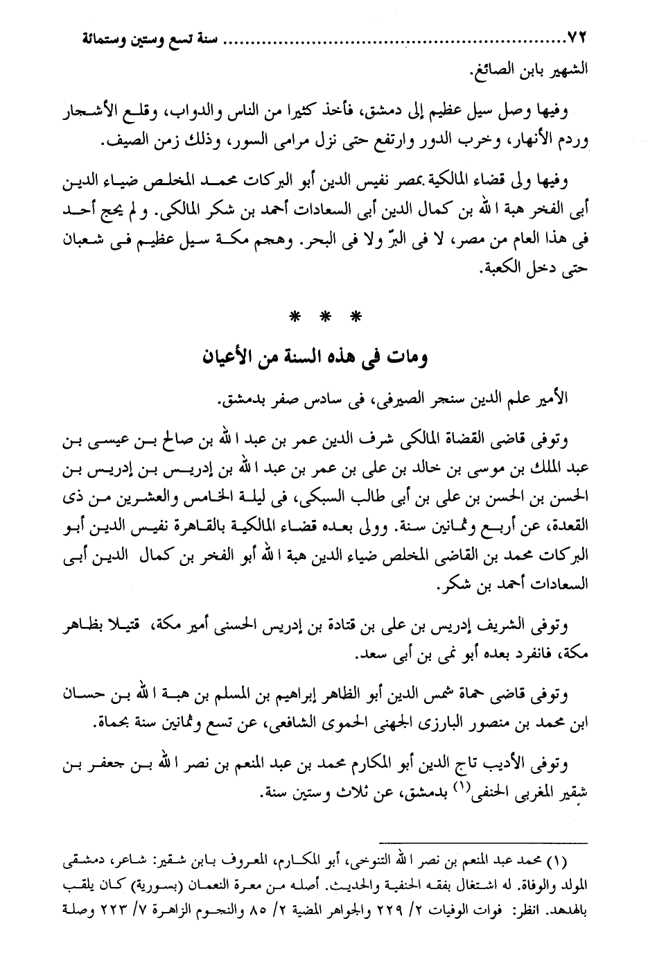 الشهير بِابْن الصَّائِغ. وفيهَا وصل سيل عَظِيم إِلَى دمشق فَأخذ كثيرا من النَّاس وَالدَّوَاب وَقلع الْأَشْجَار وردم الْأَنْهَار وَخرب الدّور وارتفع حَتَّى نزل مرامي السُّور وَذَلِكَ زمن الصَّيف. وفيهَا ولي قَضَاء الْمَالِكِيَّة بِمصْر نَفِيس الدّين أَبُو البركات مُحَمَّد المخلص ضِيَاء الدّين أبي الْفَخر هبة الله بن كَمَال الدّين أبي السعادات أَحْمد بن شكر الْمَالِكِي. وَلم يحجّ أحد فِي هَذَا الْعَام من مصر لَا فِي الْبر وَلَا فِي الْبَحْر. وهجم مَكَّة سيل عَظِيم فِي شعْبَان حَتَّى دخل الْكَعْبَة. وَمَات فِي هَذِه السّنة من الْأَعْيَان الْأَمِير علم الدّين سنجر الصَّيْرَفِي فِي سادس صفر بِدِمَشْق. وَتُوفِّي قَاضِي الْقُضَاة الْمَالِكِي شرف الدّين عمر بن عبد الله بن صَالح بن عيسي بن عبد الْملك بن مُوسَى بن خَالِد بن على بن عمر بن عبد الله بن إِدْرِيس بن إِدْرِيس بن الْحسن بن الْحسن بن على بن أبي طَالب السُّبْكِيّ فِي لَيْلَة الْخَامِس وَالْعِشْرين من ذِي الْقعدَة عَن أَربع وَثَمَانِينَ سنة. وَولي بعده قَضَاء الْمَالِكِيَّة بِالْقَاهِرَةِ نَفِيس الدّين أَبُو البركات مُحَمَّد بن القَاضِي المخلص ضِيَاء الدّين هبة الله أَبُو الْفَخر بن كَمَال الدّين أبي السعادات أَحْمد بن شكر. وَتُوفِّي الشريف إِدْرِيس بن على بن قَتَادَة بن إِدْرِيس الحسني أَمِير مَكَّة قَتِيلا بِظَاهِر مَكَّة فَانْفَرد بعده أَبُو نمي بن أبي سعد. وَتُوفِّي قَاضِي حماة شمس الدّين أَبُو الظَّاهِر إِبْرَاهِيم بن الْمُسلم بن هبة الله بن حسان ابْن مُحَمَّد بن مَنْصُور الْبَارِزِيّ الْجُهَنِيّ الْحَمَوِيّ الشَّافِعِي عَن تسع وَثَمَانِينَ سنة بحماة. وَتُوفِّي الأديب تَاج الدّين أَبُو المكارم مُحَمَّد بن عبد الْمُنعم بن نصر الله بن جَعْفَر بن شقير المغربي الْحَنَفِيّ بِدِمَشْق عَن ثَلَاث وَسِتِّينَ سنة.