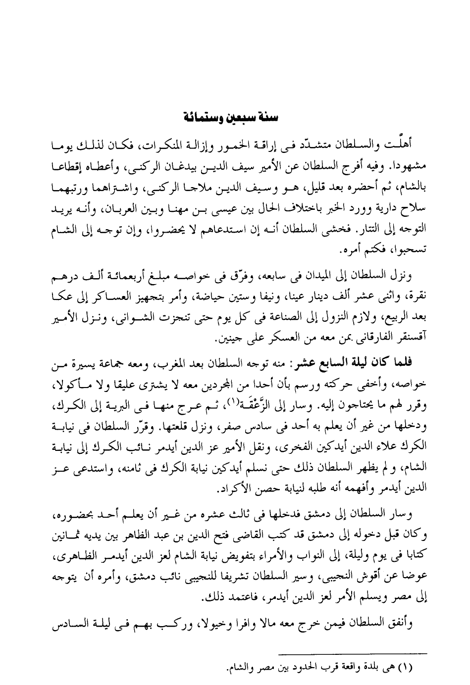 سنة سبعين وسِتمِائَة أهلت وَالسُّلْطَان متشدد فِي إِرَاقَة الْخُمُور وَإِزَالَة الْمُنْكَرَات فَكَانَ لذَلِك يَوْمًا مشهودا. وَفِيه أفرج السُّلْطَان عَن الْأَمِير سيف الدّين بيدغان الركني وَأَعْطَاهُ إقطاعا بِالشَّام ثمَّ أحضرهُ بعد قَلِيل هُوَ وَسيف الدّين ملاجا الركني واشتراهما ورتبهما سلَاح دارية وَورد الْخَبَر باخْتلَاف الْحَال بَين عيسي بن مهنا وَبَين العربان وَإنَّهُ يُرِيد التَّوَجُّه إِلَى التتار. فخشي السُّلْطَان إِنَّه إِن استدعاهم لَا يحضروا وَإِن توجه إِلَى الشَّام تسحبوا فكتم أمره. وَنزل السُّلْطَان إِلَى الميدان فِي سابعه وَفرق فِي خواصه مبلغ أَرْبَعمِائَة ألف دِرْهَم نقرة واثني عشر ألف دِينَار عينا ونيفا وَسِتِّينَ حياضة وَأمر بتحهيز العساكر إِلَى عكا بعد الرّبيع ولازم النُّزُول إِلَى الصِّنَاعَة فِي كل يَوْم حَتَّى تنجزت الشواني وَنزل الْأَمِير آقسنقر الفارقاني. بِمن مَعَه من الْعَسْكَر على جينين. فَلَمَّا كَانَ لَيْلَة السَّابِع عشر: مِنْهُ توجه السُّلْطَان بعد الْمغرب وَمَعَهُ جمَاعَة يسيرَة من خواصه وأخفي حركته ورسم بِأَن أحدا من المجردين مَعَه لَا يَشْتَرِي عليقا وَلَا مَأْكُولا وَقرر لَهُم مَا يَحْتَاجُونَ إِلَيْهِ. وَسَار إِلَى الزعقة ثمَّ عرج مِنْهَا فِي الْبَريَّة إِلَى الكرك ودخلها من غير أَن يعلم بِهِ أحد فِي سادس صفر وَنزل قلعتها. وَقرر السُّلْطَان فِي نِيَابَة الكرك عَلَاء الدّين أيدكين الفخري وَنقل الْأَمِير عز الدّين أيدمر نَائِب الكرك إِلَى نِيَابَة الشَّام وَلم يظْهر السُّلْطَان ذَلِك حَتَّى نسلم أيدكين نِيَابَة الكرك فِي ثامنه واستدعى عز الدّين أيدمر وأفهمه أَنه طلبه لنيابة حصن الأكراد. وَسَار السُّلْطَان إِلَى دمشق فَدَخلَهَا فِي ثَالِث عشره من غير أَن يعلم أحد بِحُضُورِهِ وَكَانَ قبل دُخُوله إِلَى دمشق قد كتب القَاضِي فتح الدّين بن عبد الظَّاهِر بَين يَدَيْهِ ثَمَانِينَ كتابا فِي يَوْم وَلَيْلَة إِلَى النواب والأمراء بتفويض نِيَابَة الشَّام لعز الدّين أيدمر الظَّاهِرِيّ عوضا عَن أقوش النجيبي وسير السُّلْطَان تَشْرِيفًا للنجيبي نَائِب دمشق وَأمره أَن يتَوَجَّه إِلَى مصر وَيسلم الْأَمر لعز الدّين أيدمر فاعتمد ذَلِك. وَأنْفق السُّلْطَان فِيمَن خرج مَعَه مَالا وافرا وخيولا وَركب بهم فِي لَيْلَة السَّادِس