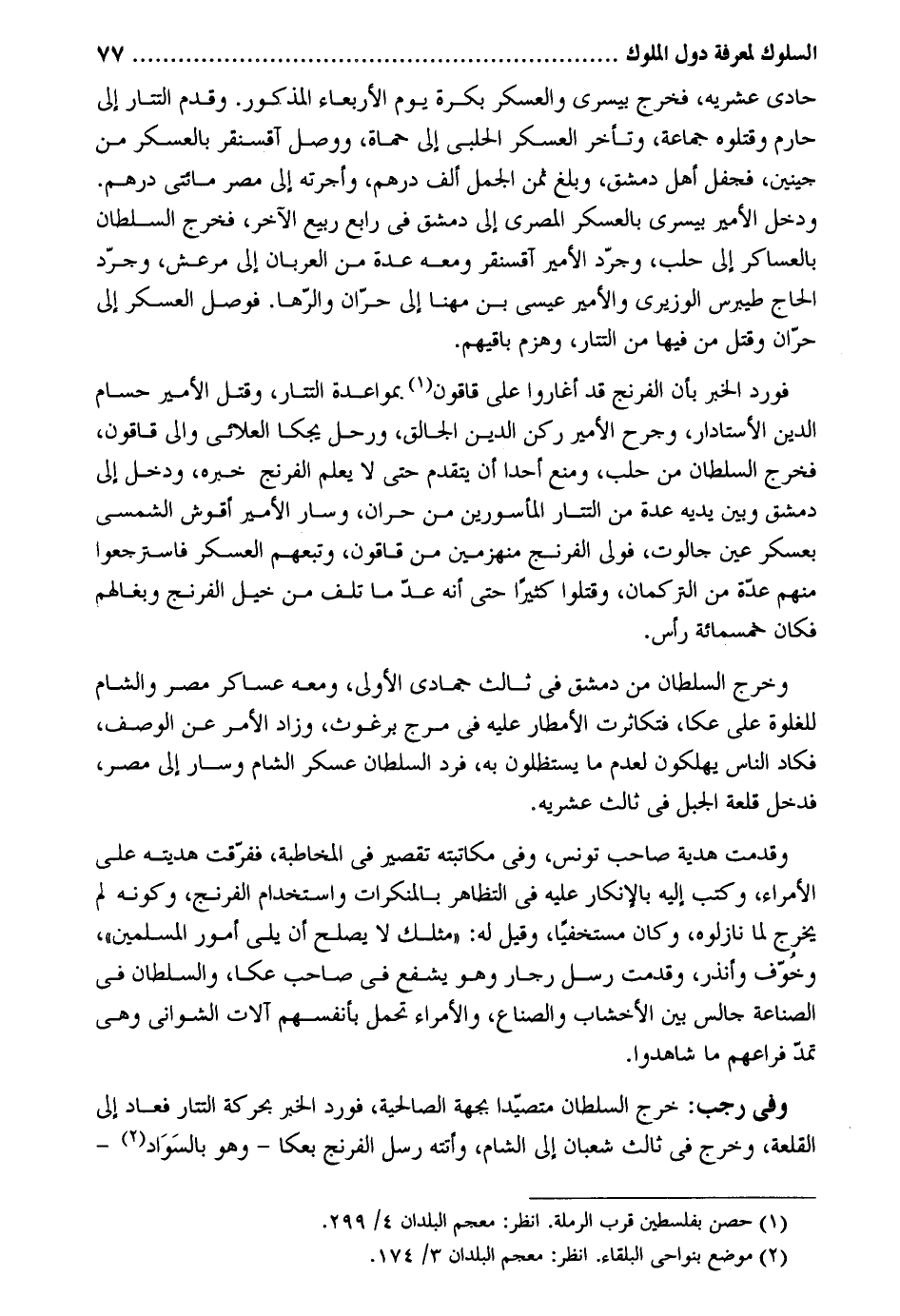 حادي عشريه فَخرج بيسري والعسكر بكرَة يَوْم الْأَرْبَعَاء الْمَذْكُور. وَقدم التتار إِلَى حارم وقتلوه جمَاعَة وَتَأَخر الْعَسْكَر الْحلَبِي إِلَى حماة وَوصل آقسنقر بالعسكر من جينين فجفل أهل دمشق وَبلغ ثمن الْجمل ألف دِرْهَم وأجرته إِلَى مصر مِائَتي دِرْهَم. وَدخل الْأَمِير بيسري بالعسكر الْمصْرِيّ إِلَى دمشق فِي رَابِع ربيع الآخر فَخرج السُّلْطَان بالعساكر إِلَى حلب وجرد الْأَمِير آقسنقر وَمَعَهُ عدَّة من العربان إِلَى مرعش وجرد الْحَاج طيبرس الوزيري والأمير عيسي بن مهنا إِلَى حران والرها. فوصل الْعَسْكَر إِلَى حران وَقتل من فِيهَا من التتار وَهزمَ باقيهم. فورد الْخَبَر بِأَن الفرنج قد أَغَارُوا على قاقون. بمواعدة التتار وَقتل الْأَمِير حسام الدّين الأستادار وجرح الْأَمِير ركن الدّين الجالق ورحل يجكا العلائي وَالِي قاقون فَخرج السُّلْطَان من حلب وَمنع أحدا أَن يتَقَدَّم حَتَّى لَا يعلم الفرنج خَبره وَدخل إِلَى دمشق وَبَين يَدَيْهِ عدَّة من التتار المأسورين من حران وَسَار الْأَمِير أقوش الشمسي بعسكر عين جالوت فولي الفرنج منهزمين من قاقون وتبعهم الْعَسْكَر فاسترجعوا مِنْهُم عدَّة من التركمان وَقتلُوا كثيرا حَتَّى أَنه عد مَا تلف من خيل الفرنج وبغالهم فَكَانَ خَمْسمِائَة رَأس. وَخرج السُّلْطَان من دمشق فِي ثَالِث جُمَادَى الأولى وَمَعَهُ عَسَاكِر مصر وَالشَّام للغلوة على عكا فتكاثرت الأمطار عَلَيْهِ فِي مرج برغوث وَزَاد الْأَمر عَن الْوَصْف فكاد النَّاس يهْلكُونَ لعدم مَا وقدمت هَدِيَّة صَاحب تونس وَفِي مُكَاتبَته تَقْصِير فِي المخاطبة ففرقت هديته على الْأُمَرَاء وَكتب إِلَيْهِ بالإنكار عَلَيْهِ فِي التظاهر بالمنكرات واستخدام الفرنج وَكَونه لم يخرج لما نازلوه وَكَانَ مستخفيا وَقيل لَهُ: مثلك لَا يصلح أَن يَلِي أُمُور الْمُسلمين وَخَوف وأنذر وقدمت رسل رجار وَهُوَ يشفع فِي صَاحب عكا وَالسُّلْطَان فِي الصِّنَاعَة جَالس بَين الأخشاب والصناع والأمراء تحمل بِأَنْفسِهِم آلَات الشواني وَهِي تمد فراعهم مَا شاهدوا. وَفِي رَجَب: خرج السُّلْطَان متصيدا بِجِهَة الصالحية فورد الْخَبَر بحركة التتار فَعَاد إِلَى القلعة وَخرج فِي ثَالِث شعْبَان إِلَى الشَّام وأتته رسل الفرنج بعكا - وَهُوَ بِالسَّوَادِ -