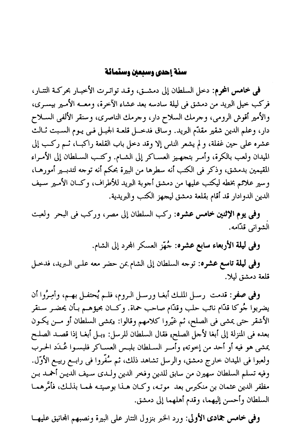 سنة إِحْدَى وَسبعين وسِتمِائَة فِي خَامِس الْمحرم: دخل السُّلْطَان إِلَى دمشق وَقد تَوَاتَرَتْ الْأَخْبَار بحركة التتار فَركب خيل الْبَرِيد من دمشق فِي لَيْلَة سادسه بعد عشَاء الْآخِرَة وَمَعَهُ الْأَمِير بيسري والأمير أقوش الرُّومِي وجرمك السِّلَاح دَار وجرمك الناصري وسنقر الألفي السِّلَاح دَار وَعلم الدّين شقير مقدم الْبَرِيد. وسَاق فَدخل قلعة الْجَبَل فِي يَوْم السبت ثَالِث عشره على حِين غَفلَة وَلم يشْعر النَّاس إِلَّا وَقد دخل بَاب القلعة رَاكِبًا ثمَّ ركب إِلَى الميدان وَلعب بالكرة وَأمر بتجهيز العساكر إِلَى الشَّام. وَكتب السُّلْطَان إِلَى الْأُمَرَاء المقيمين بِدِمَشْق وَذكر فِي الْكتب أَنه سطرها من البيرة بِحكم أَنه توجه لتدبير أمورها وسير علائم بِخَطِّهِ ليكتب عَلَيْهَا من دمشق أجوبة الْبَرِيد للأطراف وَكَانَ الْأَمِير سيف الدّين الدوادار قد أَقَامَ بقلعة دمشق ليجهز الْكتب والبريدية. وَفِي يَوْم الْإِثْنَيْنِ خَامِس عشره: ركب السُّلْطَان إِلَى مصر وَركب فِي الْبَحْر ولعبت الشواني قدامه. وَفِي لَيْلَة الْأَرْبَعَاء سَابِع عشره: جهز الْعَسْكَر الْمُجَرّد إِلَى الشَّام. وَفِي لَيْلَة تَاسِع عشرَة: توجه السُّلْطَان إِلَى الشَّام بِمن حضر مَعَه على الْبَرِيد فَدخل قلعة دمشق لَيْلًا. وَفِي صفر: قدمت رسل الْملك أبغا ورسل الرّوم فَلم يحتفل بهم وَأمرُوا أَن يضْربُوا جوكا قُدَّام نَائِب حلب وَقُدَّام صَاحب حماة. وَكَانَ مجيؤهم بِأَن يحضر سنقر الْأَشْقَر حَتَّى يمشي فِي الصُّلْح ثمَّ غيروا كَلَامهم وَقَالُوا: يمشي السُّلْطَان أَو من يكون بعده فِي الْمنزلَة إِلَى أبغا لأجل الصُّلْح فَقَالَ السُّلْطَان للرسل: بل أبغا إِذا قصد الصُّلْح يمشي هُوَ فِيهِ أَو أحد من إخْوَته وَأمر السُّلْطَان بِلبْس العساكر فلبسوا عدد الْحَرْب ولعبوا فِي الميدان خَارج دمشق وَالرسل تشاهد ذَلِك ثمَّ سفروا فِي رَابِع ربيع الأول. وَفِيه تسلم السُّلْطَان سهيرن من سَابق للدّين وفخر الدّين وَلَدي سيف الدّين أَحْمد بن مظفر الدّين عُثْمَان بن منكبرس بعد مَوته وَكَانَ هَذَا بوصيته لَهما بذلك فَأَمرهمَا السُّلْطَان وَأحسن إِلَيْهِمَا وَقدم أهلهما إِلَى دمشق. وَفِي خَامِس جُمَادَى الأولى: ورد الْخَبَر بنزول التتار على البيرة ونصبهم المجانيق عَلَيْهَا