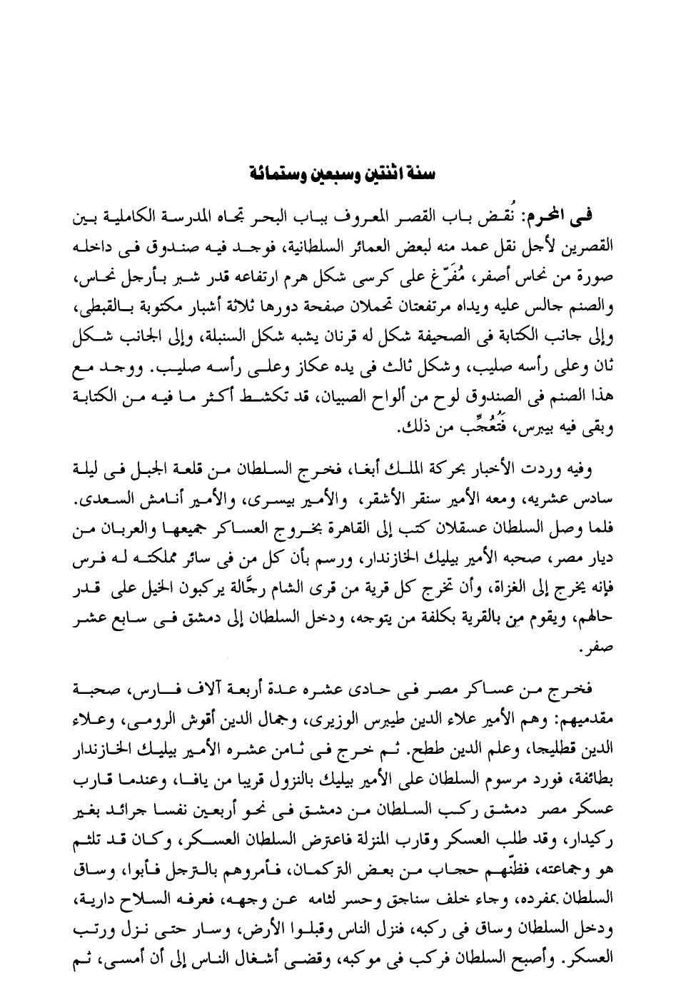 فِي الْمحرم: نقض بَاب الْقصر الْمَعْرُوف بِبَاب الْبَحْر تجاه الْمدرسَة الكاملية بَين القصرين لأجل نقل عمد مِنْهُ لبَعض العمائر السُّلْطَانِيَّة فَوجدَ فِيهِ صندوق فِي دَاخله صُورَة من نُحَاس أصفر مفرغ على كرْسِي شكل هرم ارتفاعه قدر شبر بأرجل نُحَاس والصنم جَالس عَلَيْهِ ويداه مرتفعتان تحملان صفحة دورها ثَلَاثَة أشبار مَكْتُوبَة بالقبطي وَإِلَى جَانب الْكِتَابَة فِي الصَّحِيفَة شكل لَهُ قرنان يشبه شكل السنبلة وَإِلَى الْجَانِب شكل ثَان وعَلى رَأسه صَلِيب وشكل ثَالِث فِي يَده عكاز وعَلى رَأسه صَلِيب. وَوجد مَعَ هَذَا الصَّنَم فِي الصندوق لوح من أَلْوَاح الصّبيان قد تكشط أَكثر مَا فِيهِ من الْكِتَابَة وَبَقِي فِيهِ بيبرس فتعجب من ذَلِك. وَفِيه وَردت الْأَخْبَار بحركة الْملك أبغا فَخرج السُّلْطَان من قلعة الْجَبَل فِي لَيْلَة سادس عشريه وَمَعَهُ الْأَمِير سنقر الْأَشْقَر والأمير بيسري والأمير أنامش السَّعْدِيّ. فَلَمَّا وصل السُّلْطَان عسقلان كتب إِلَى الْقَاهِرَة بِخُرُوج العساكر جَمِيعهَا والعربان من ديار مصر صَحبه الْأَمِير بيليك الخازندار ورسم بِأَن كل من فِي سَائِر مَمْلَكَته لَهُ فرس فَإِنَّهُ يخرج إِلَى الْغُزَاة وَأَن تخرج كل قَرْيَة من قري الشَّام رجالة يركبون الْخَيل على قدر حَالهم وَيقوم من بالقرية بكلفة من يتَوَجَّه وَدخل السُّلْطَان إِلَى دمشق فِي سَابِع عشر صفر. فَخرج من عَسَاكِر مصر فِي حادي عشره عدَّة أَرْبَعَة آلَاف فَارس صُحْبَة مقدميهم: وهم الْأَمِير عَلَاء الدّين طيبرس الوزيري وجمال الدّين أقوش الرُّومِي وعلاء الدّين قطليجا وَعلم الدّين ططح. ثمَّ خرج فِي ثامن عشره الْأَمِير بيليك الخازندار بطَائفَة فورد مرسوم السُّلْطَان على الْأَمِير بيليك بالنزول قَرِيبا من يافا وعندما قَارب عَسْكَر مصر دمشق ركب السُّلْطَان من دمشق فِي نَحْو أَرْبَعِينَ نفسا جرائد بِغَيْر ركيدار وَقد طلب الْعَسْكَر وقارب الْمنزلَة فَاعْترضَ السُّلْطَان الْعَسْكَر وَكَانَ قد تلثم هُوَ وجماعته فظنهم حجاب من بعض التركمان فأمروهم بالترجل فَأَبَوا وسَاق السُّلْطَان بمفرده وَجَاء خلف سناجق وحسر لثامه عَن وَجهه فَعرفهُ السِّلَاح دارية وَدخل السُّلْطَان وسَاق فِي رَكبه فَنزل النَّاس وقبلوا الأَرْض وَسَار حَتَّى نزل ورتب الْعَسْكَر. وَأصْبح السُّلْطَان فَركب فِي موكبه وَقضي أشغال النَّاس إِلَى أَن أمسي ثمَّ