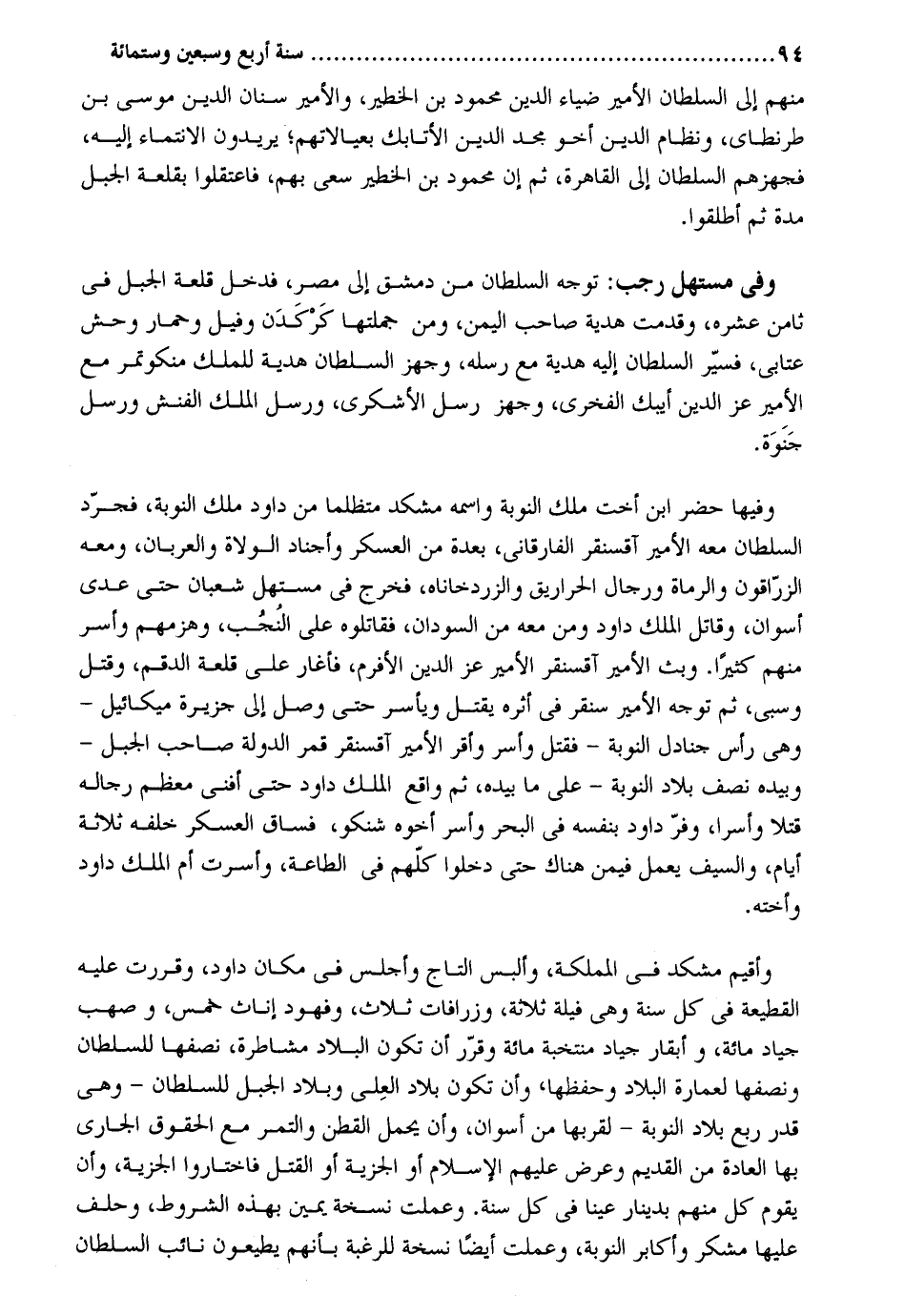 مِنْهُم إِلَى السُّلْطَان الْأَمِير ضِيَاء الدّين مَحْمُود بن الخطير والأمير سِنَان الدّين مُوسَى بن طرنطاي ونظام الدّين أَخُو مجد الدّين الأتابك بعيالاتهم يُرِيدُونَ الانتماء إِلَيْهِ فجهزهم السُّلْطَان إِلَى الْقَاهِرَة ثمَّ إِن مَحْمُود بن الخطير سعي بهم فاعتقلوا بقلعة الْجَبَل مُدَّة ثمَّ أطْلقُوا. وَفِي مستهل رَجَب: توجه السُّلْطَان من دمشق إِلَى مصر فَدخل قلعة الْجَبَل فِي ثامن عشره وقدمت هَدِيَّة صَاحب الْيمن وَمن جُمْلَتهَا كركدن وفيل وحمار وَحش عتابي فسير السُّلْطَان إِلَيْهِ هَدِيَّة مَعَ رسله وجهز السُّلْطَان هَدِيَّة للْملك منكوتمر مَعَ الْأَمِير عز الدّين أيبك الفخري وجهز رسل الأشكري ورسل الْملك الفنش ورسل جنوة. وفيهَا حضر ابْن أُخْت ملك النّوبَة واسْمه مشكد متظلما من دَاوُد ملك النّوبَة فَجرد السُّلْطَان مَعَه الْأَمِير آقسنقر الفارقاني بعده من الْعَسْكَر وأجناد الْوُلَاة والعربان وَمَعَهُ الزراقون وَالرُّمَاة ورجمال الحراريق والزردخاناه فَخرج فِي مستهل شعْبَان حَتَّى عدي أسوان وَقَاتل الْملك دَاوُد وَمن مَعَه من السودَان فقاتلوه على النجب وَهَزَمَهُمْ وَأسر مِنْهُم كثيرا. وَبث الْأَمِير آقسنقر الْأَمِير عز الدّين الأفرم فَأَغَارَ على قلعة الدقم وَقتل وَسبي ثمَّ توجه الْأَمِير سنقر فِي أَثَره يقتل وياسر حَتَّى وصل إِلَى جريرة ميكاليل وَهِي رَأس جنادل النّوبَة فَقتل وَأسر وَأقر الْأَمِير آقسنقر قمر الدولة صَاحب الْجَبَل وَبِيَدِهِ نصف بِلَاد النّوبَة على مَا بِيَدِهِ ثمَّ وَاقع الْملك دَاوُد حَتَّى أفني مُعظم رجماله قتلا وأسرا وفر دَاوُد بِنَفسِهِ فِي الْبَحْر وَأسر أَخُوهُ شنكو فساق الْعَسْكَر خَلفه ثَلَاثَة أَيَّام وَالسيف يعْمل فِيمَن هُنَاكَ حَتَّى دخلُوا كلهم فِي الطَّاعَة وأسرت أم الْملك دَاوُد وَأُخْته. وأقيم مشكد فِي المملكة وألبس التَّاج وأجلس فِي مَكَان دَاوُد وقررت عَلَيْهِ الْقطعَة فِي كل سنة وَهِي فيلة ثَلَاثَة وزرافات ثَلَاث وفهود إناث خمس وصهب جِيَاد مائَة وأبقار جِيَاد منتخبة مائَة وَقرر أَن تكون الْبِلَاد مشاطرة نصفهَا للسُّلْطَان وَنِصْفهَا لعمارة الْبِلَاد وحفظها وَأَن تكون بِلَاد العلى وبلاد الْجَبَل للسُّلْطَان وَهِي قدر ربع بِلَاد النّوبَة لقربها من أسوان وَأَن يحمل الْقطن وَالتَّمْر مَعَ الْحُقُوق الْجَارِي بهَا الْعَادة من الْقَدِيم وَعرض عَلَيْهِم الْإِسْلَام أَو الْجِزْيَة أَو الْقَتْل فَاخْتَارُوا الْجِزْيَة وَأَن يقوم كل مِنْهُم بِدِينَار عينا فِي كل سنة. وعملت نُسْخَة يَمِين بِهَذِهِ الشُّرُوط وَحلف عَلَيْهَا مشكر وأكابر النّوبَة وعملت أَيْضا نُسْخَة للرغبة بِأَنَّهُم يطيعون نَائِب السُّلْطَان