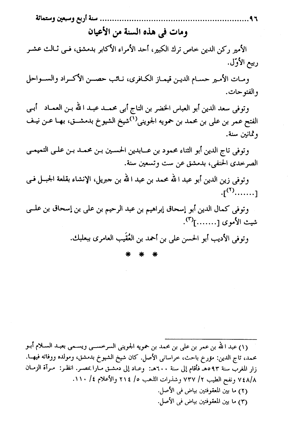 وَمَات فِي هَذِه السّنة من الْأَعْيَان الْأَمِير ركن الدّين خَاص ترك الْكَبِير أحد الْأُمَرَاء الأكابر بِدِمَشْق فِي ثَالِث عشر ربيع الأول. وَمَات الْأَمِير حسام الدّين قيماز الكافري نَائِب حصن الأكراد والسواحل والفتوحات. وَتُوفِّي سعد الدّين أَبُو الْعَبَّاس الْخضر بن التَّاج أبي مُحَمَّد عبد الله بن الْعِمَاد أبي الْفَتْح عمر بن على بن مُحَمَّد بن حمويه الْجُوَيْنِيّ شيخ الشُّيُوخ بِدِمَشْق بهَا عَن نَيف وَثَمَانِينَ سنة. وَتُوفِّي تَاج الدّين أَبُو الثَّنَاء مَحْمُود بن عابدين الْحُسَيْن بن مُحَمَّد بن على التَّمِيمِي الصرخدي الْحَنَفِيّ بِدِمَشْق عَن سِتّ وَتِسْعين سنة. وَتُوفِّي زين الدّين أَبُو عبد الله مُحَمَّد بن عبد الله بن جِبْرِيل الْإِنْشَاء لقلعة الْجَبَل فِي 000. وَتُوفِّي كَمَال الدّين أَبُو إِسْحَاق إِبْرَاهِيم بن عبد الرَّحِيم بن على بن إِسْحَاق بن على شِيث الأمو وَتُوفِّي الأديب أَبُو الْحسن على بن أَحْمد بن العقيب العامري ببعلبك.