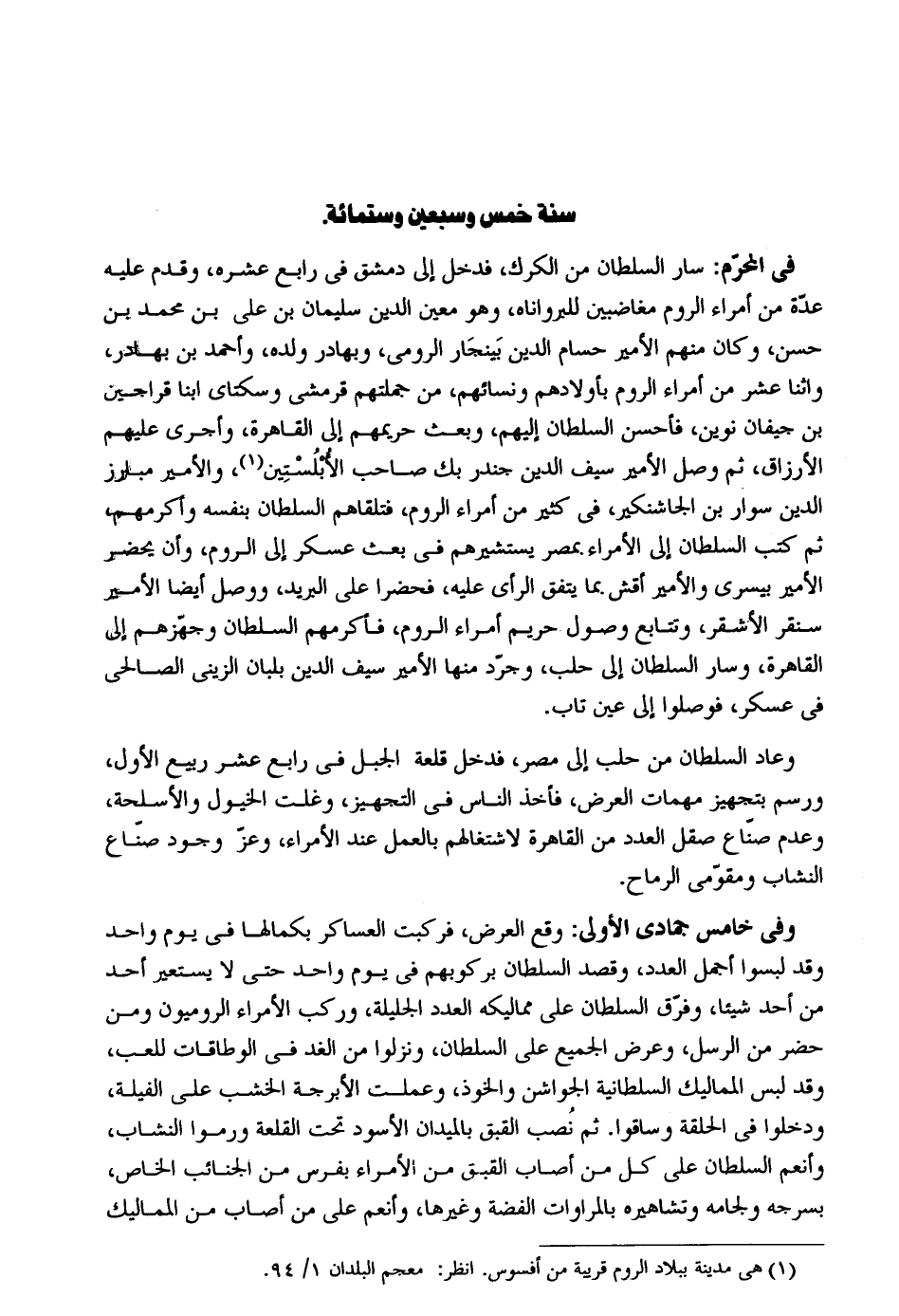 سنة خمس وَسبعين وسِتمِائَة فِي الْمحرم: سَار السُّلْطَان من الكرك فَدخل إِلَى دمشق فِي رَابِع عشره وَقدم عَلَيْهِ عدَّة من أُمَرَاء الرّوم مغاضبين للبرواناه وَهُوَ معِين الدّين سُلَيْمَان بن على بن مُحَمَّد بن حسن وَكَانَ مِنْهُم الْأَمِير حسام الدّين بينجار الرُّومِي وبهادر وَلَده وَأحمد بن بهادر وَاثنا عشر من أُمَرَاء الرّوم بأولادهم وَنِسَائِهِمْ من جُمْلَتهمْ قرمشي وسكتاي ابْنا قراجين بن جيفان نوين فَأحْسن السُّلْطَان إِلَيْهِم وَبعث حريمهم إِلَى الْقَاهِرَة وَأجْرِي عَلَيْهِم الأرزاق ثمَّ وصل الْأَمِير سيف الدّين جندر بك صَاحب الأبلستين والأمير مبارز الدّين سوار بن الجاشنكير فِي كثير من أُمَرَاء الرّوم فَتَلقاهُمْ السُّلْطَان بِنَفسِهِ وَأكْرمهمْ ثمَّ كتب السُّلْطَان إِلَى الْأُمَرَاء بِمصْر يستشيرهم فِي بعث عَسْكَر إِلَى الرّوم وَأَن يحضر الْأَمِير بيسري والأمير أقش. مِمَّا يتَّفق الرَّأْي عَلَيْهِ فحضرا على الْبَرِيد وَوصل أَيْضا الْأَمِير سنقر الْأَشْقَر وتتابع وُصُول حَرِيم أُمَرَاء الرّوم فأكرمهم السُّلْطَان وجهزهم إِلَى الْقَاهِرَة وَسَار السُّلْطَان إِلَى حلب وجرد مِنْهَا الْأَمِير سيف الدّين بلبان الزيني الصَّالِحِي فِي عَسْكَر فوصلوا إِلَى عين تَابَ. وَعَاد السُّلْطَان من حلب إِلَى مصر فَدخل قلعة الْجَبَل فِي رَابِع عشر ربيع الأول ورسم بتجهيز مهمات الْعرض فَأخذ النَّاس فِي التَّجْهِيز وغلت الْخُيُول والأسلحة وَعدم صناع صقل الْعدَد من الْقَاهِرَة لاشتغالهم بِالْعَمَلِ عِنْد الْأُمَرَاء وَعز وجود صناع النشاب ومقومي الرماح. وَفِي خَامِس جُمَادَى الأولى: وَقع الْعرض فركبت العساكر بكمالها فِي يَوْم وَاحِد وَقد لبسوا أجمل الْعدَد وَقصد السُّلْطَان بركوبهم فِي يَوْم وَاحِد حَتَّى لَا يستعير أحد من أحد شَيْئا وَفرق السُّلْطَان على مماليكه الْعدَد الجليلة وَركب الْأُمَرَاء الروميون وَمن حضر من الرُّسُل وَعرض الْجَمِيع على السُّلْطَان ونزلوا من الْغَد فِي الوطاقات للعب وَقد لبس المماليك السُّلْطَانِيَّة الجواشن والخوذ وعملت الأبرجة الْخشب على الفيلة ودخلوا فِي الْحلقَة وَسَاقُوا. ثمَّ نصب القبق بالميدان الْأسود تَحت القلعة ورموا النشاب وأنعم السُّلْطَان على كل من أصَاب القبق من الْأُمَرَاء بفرس من الجنائب الْخَاص بسرجه ولجامه وتشاهيره بالمراوات الْفضة وَغَيرهَا وأنعم على من أصَاب من المماليك