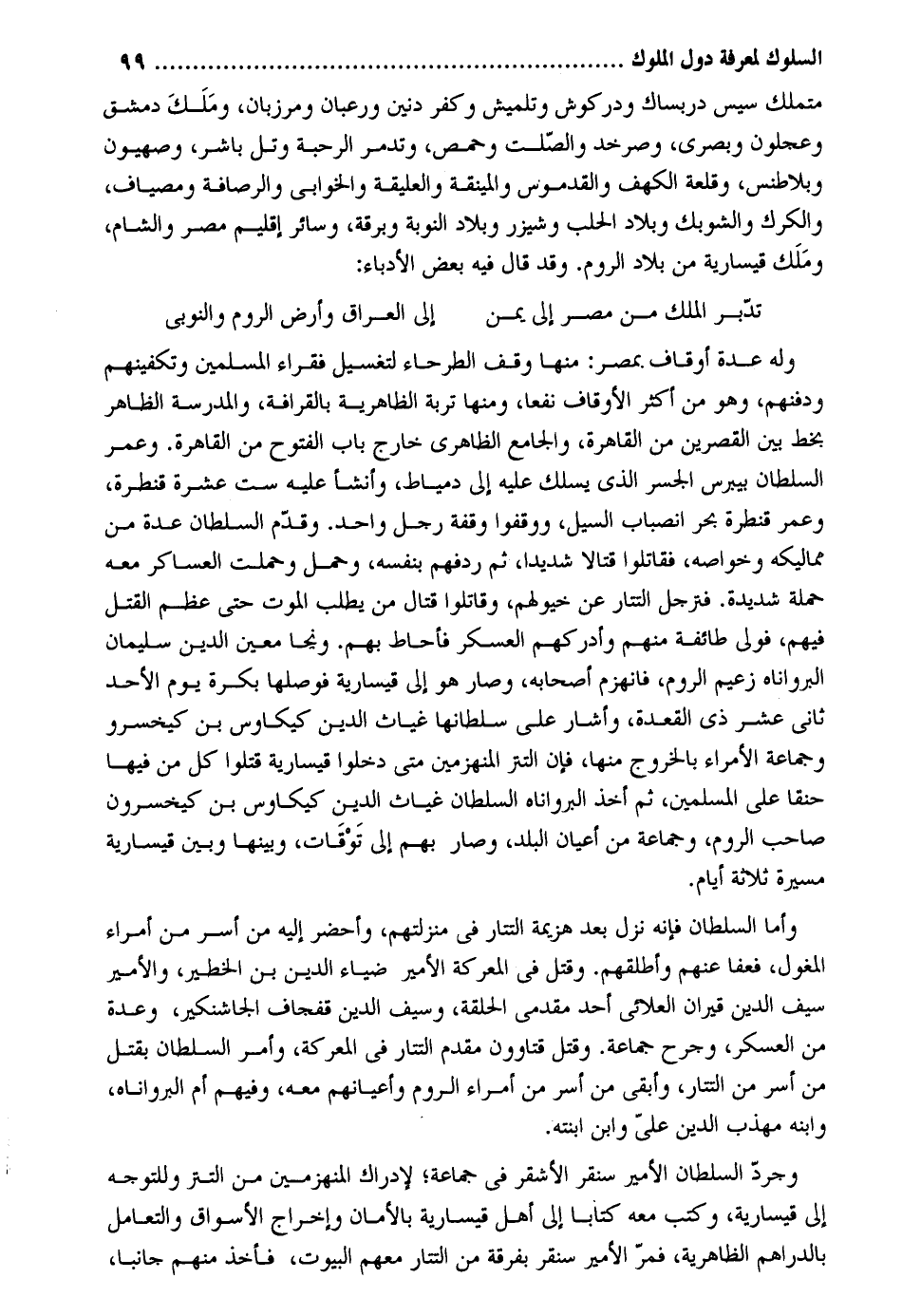 متملك سيس دربساك ودركوش وتلميش وَكفر دنين ورعبان ومرزبان وَملك دمشق وعجلون وبصري وصرخد والصلت وحمص وتدمر الرحبة وتل بَاشر وصهيون وبلاطنس وقلعة الْكَهْف والقدموس والدينقة العليقة والخوابي والرصافة ومصياف والكرك والشوبك وبلاد الْحَلب وشيزر وبلاد النّوبَة وبرقة وَسَائِر إقليم مصر وَالشَّام وَملك قيسارية من بِلَاد الرّوم. وَقد قَالَ فِيهِ بعض الأدباء: تدبر الْملك من مصر إِلَى يمن إِلَى الْعرَاق وَأَرْض الرّوم والنوبي وَله عدَّة أوقاف بِمصْر: مِنْهَا وقف الطرحاء لتغسيل فُقَرَاء الْمُسلمين وتكفينهم ودفنهم وَهُوَ من أَكثر الْأَوْقَاف نفعا وَمِنْهَا تربة الظَّاهِرِيَّة بالقرافة والمدرسة الظَّاهِر بِخَط بَين القصرين من الْقَاهِرَة وَالْجَامِع الظَّاهِرِيّ خَارج بَاب الْفتُوح من الْقَاهِرَة. وَعمر السُّلْطَان بيبرس الجسر الَّذِي يسْلك عَلَيْهِ إِلَى دمياط وَأَنْشَأَ عَلَيْهِ سِتّ عشرَة قنطرة وَعمر قنطرة بَحر انصباب السَّيْل ووقفوا وَقْفَة رجل وَاحِد. وَقدم السُّلْطَان عدَّة من مماليكه وخواصه فَقَاتلُوا قتالا شَدِيدا ثمَّ رَدفَهُمْ بِنَفسِهِ وَحمل وحملت العساكر مَعَه حَملَة شَدِيدَة. فترجل التتار عَن خيولهم وقاتلوا قتال من يطْلب الْمَوْت حَتَّى عظم الْقَتْل فيهم فولي طَائِفَة مِنْهُم وأدركهم الْعَسْكَر فأحاط بهم. وَنَجَا معِين الدّين سُلَيْمَان البرواناه زعيم الرّوم فَانْهَزَمَ أَصْحَابه وَصَارَ هُوَ إِلَى قيسارية فوصلها بكرَة يَوْم الْأَحَد ثَانِي عشر ذِي الْقعدَة وَأَشَارَ على سلطانها غياث الدّين كيكاوس بن كيخسرو وَجَمَاعَة الْأُمَرَاء بِالْخرُوجِ مِنْهَا فَإِن التتر المنهزمين مَتى دخلُوا قيسارية قتلوا كل من فِيهَا حنقا على الْمُسلمين ثمَّ أَخذ البرواناه السُّلْطَان غياث الدّين كيكاوس بن كيخسرون صَاحب الرّوم وَجَمَاعَة من أَعْيَان الْبَلَد وَصَارَ بهم إِلَى توقات وَبَينهَا وَبَين قيسارية مسيرَة ثَلَاثَة أَيَّام. وَأما السُّلْطَان فَإِنَّهُ نزل بعد هزيمَة التتار فِي مَنْزِلَتهمْ وأحضر إِلَيْهِ من أسر من أُمَرَاء المغول فَعَفَا عَنْهُم وأطلقهم. وَقتل فِي المعركة الْأَمِير ضِيَاء الدّين بن الخطير والأمير سيف الدّين قيران العلائي أحد مقدمي الْحلقَة وَسيف الدّين قفجاف الجاشنكير وعدة من الْعَسْكَر وجرح جمَاعَة. وَقتل قتاوون مقدم التتار فِي المعركة وَأمر السُّلْطَان بقتل من أسر من التتار وأبقي من أسر من أُمَرَاء الرّوم وأعيانهم مَعَه وَفِيهِمْ أم البرواناه وَابْنه مهذب الدّين على وَابْن ابْنَته. وجرد السُّلْطَان الْأَمِير سنقر الْأَشْقَر فِي جمَاعَة لإدراك المنهزمين من التتر وللتوجه إِلَى قيسارية وَكتب مَعَه كتابا إِلَى أهل قيسارية بالأمان وَإِخْرَاج الْأَسْوَاق والتعامل بِالدَّرَاهِمِ الظَّاهِرِيَّة فَمر الْأَمِير سنقر بفرقة من التتار مَعَهم الْبيُوت فَأخذ مِنْهُم جانبا