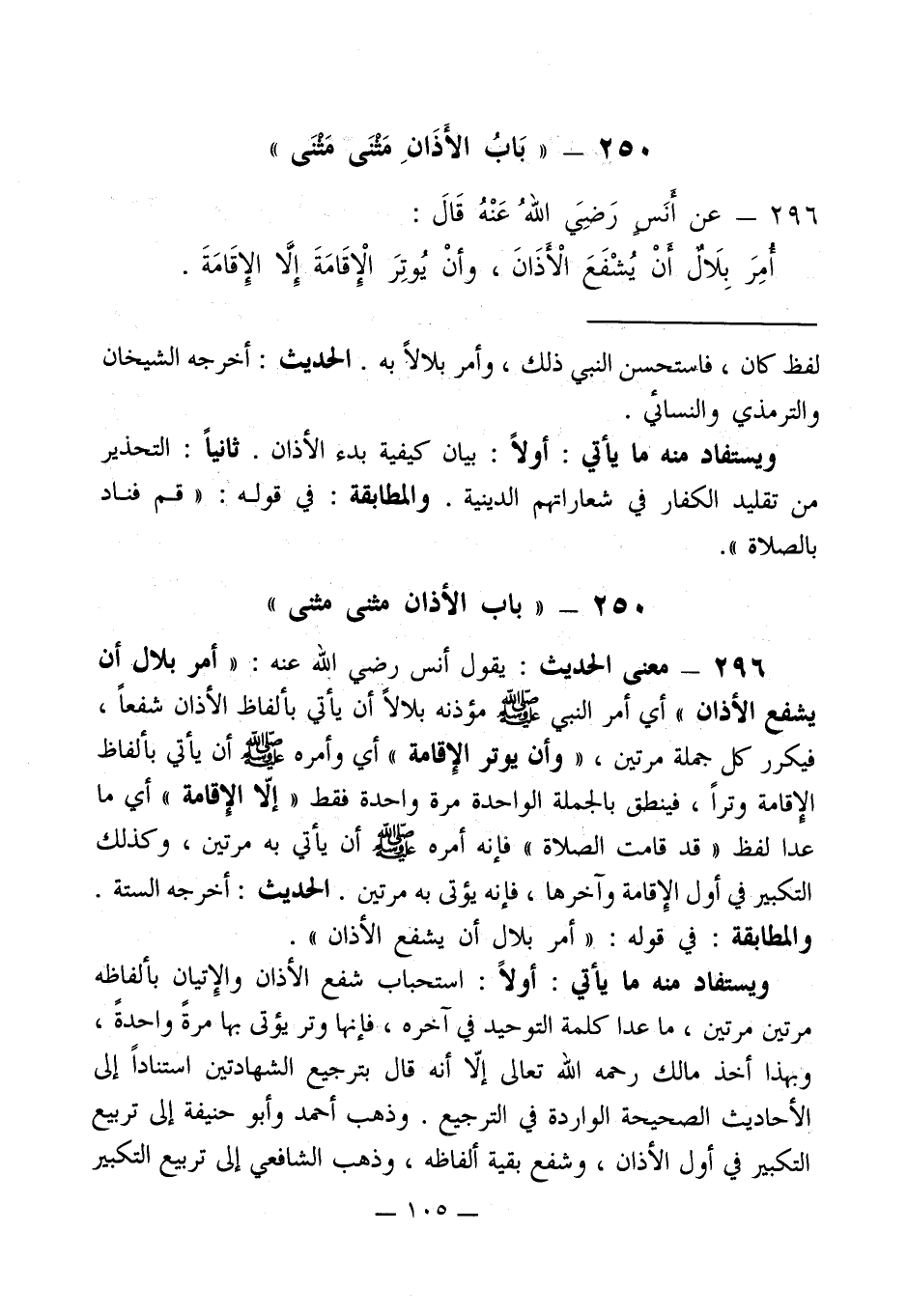 296 - معنى الحديث: يقول أنس رضي الله عنه: " أمر بلال أن يشفع الأذان " أي أمر النبي - صلى الله عليه وسلم - مؤذنه بلالاً أن يأتي بألفاظ الأذان شفعاً، فيكرر كل جملة مرتين، " وأن يوتر الإِقامة " أي وأمره - صلى الله عليه وسلم - أن يأتي بألفاظ الإقامة وتراً، فينطق بالجملة الواحدة مرة واحدة فقط " إلاّ الإقامة " أي ما عدا لفظ " قد قامت الصلاة " فإنه أمره - صلى الله عليه وسلم - أن يأتي به مرتين، وكذلك التكبير في أول الإِقامة وآخرها، فإنه يؤتى به مرتين. الحديث: أخرجه الستة.
