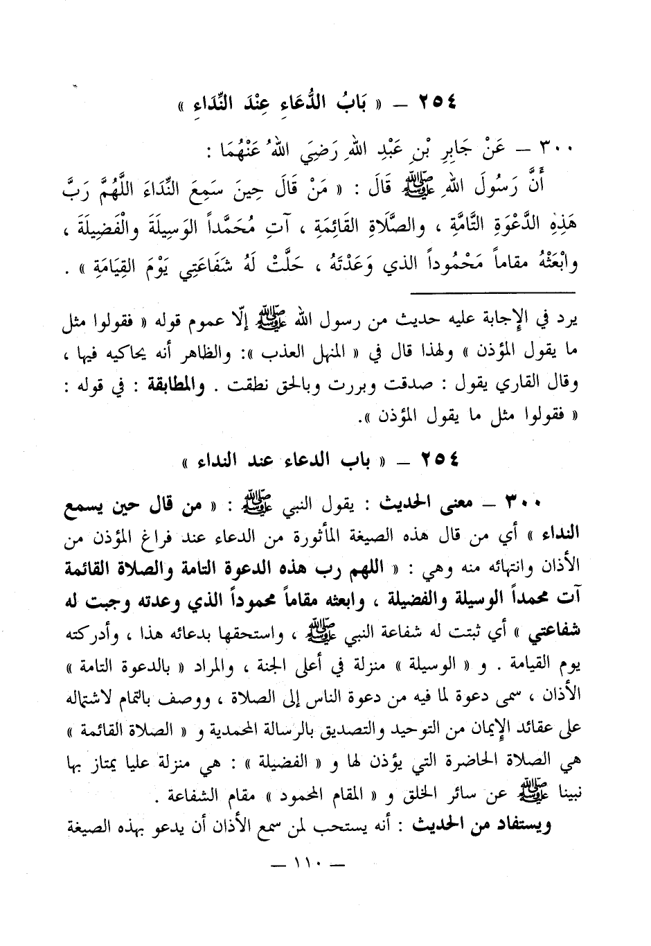 300 - معنى الحديث: يقول النبي - صلى الله عليه وسلم -: " من قال حين يسمع النداء " أي من قال هذه الصيغة المأثورة من الدعاء عند فراغ المؤذن من الأذان وانتهائه منه وهي: " اللهم رب هذه الدعوة التامة والصلاة القائمة آت محمداً الوسيلة والفضيلة، وابعثه مقاماً محموداً الذي وعدته وجبت له شفاعتي " أي ثبتت له شفاعة النبي - صلى الله عليه وسلم -، واستحقها بدعائه هذا، وأدركته يوم القيامة. و" الوسيلة " منزلة في أعلى الجنة، والمراد " بالدعوة التامة " الأذان، سمى دعوة لما فيه من دعوة الناس إلى الصلاة، ووصف بالتمام لاشتماله على عقائد الإِيمان من التوحيد والتصديق بالرسالة المحمدية و" الصلاة القائمة " هى الصلاة الحاضرة التي يؤذن لها و" الفضيلة ": هي منزلة عليا يمتاز بها نبينا - صلى الله عليه وسلم - عن سائر الخلق و" المقام المحمود " مقام الشفاعة.