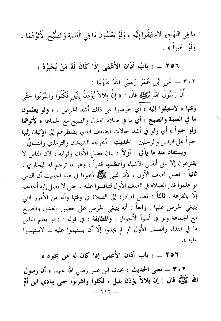وقتها " لاستبقوا إليه " أي لحرصوا على ذلك أشد الحرص. " ولو يعلمون ما في العتمة والصبح " أي ما في صلاة العشاء والصبح مع الجماعة " لأتوهما ولو حبواً " أي ولو في أشد حالات الضعف الذي يضطرهم إلى الإِتيان إليها حبواً على اليدين والرجلين. الحديث: أخرجه الشيخان والترمذي والنسائي.