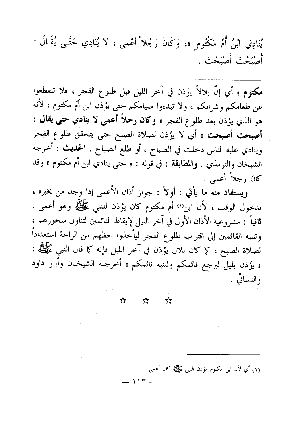يُنَادِيَ ابْنُ أُمِّ مَكْتُومٍ"، وَكَانَ رَجُلاً أعْمى، لا يُنَادِي حَتَّى يُقَالَ: أصْبَحْتَ أصْبَحْتَ.