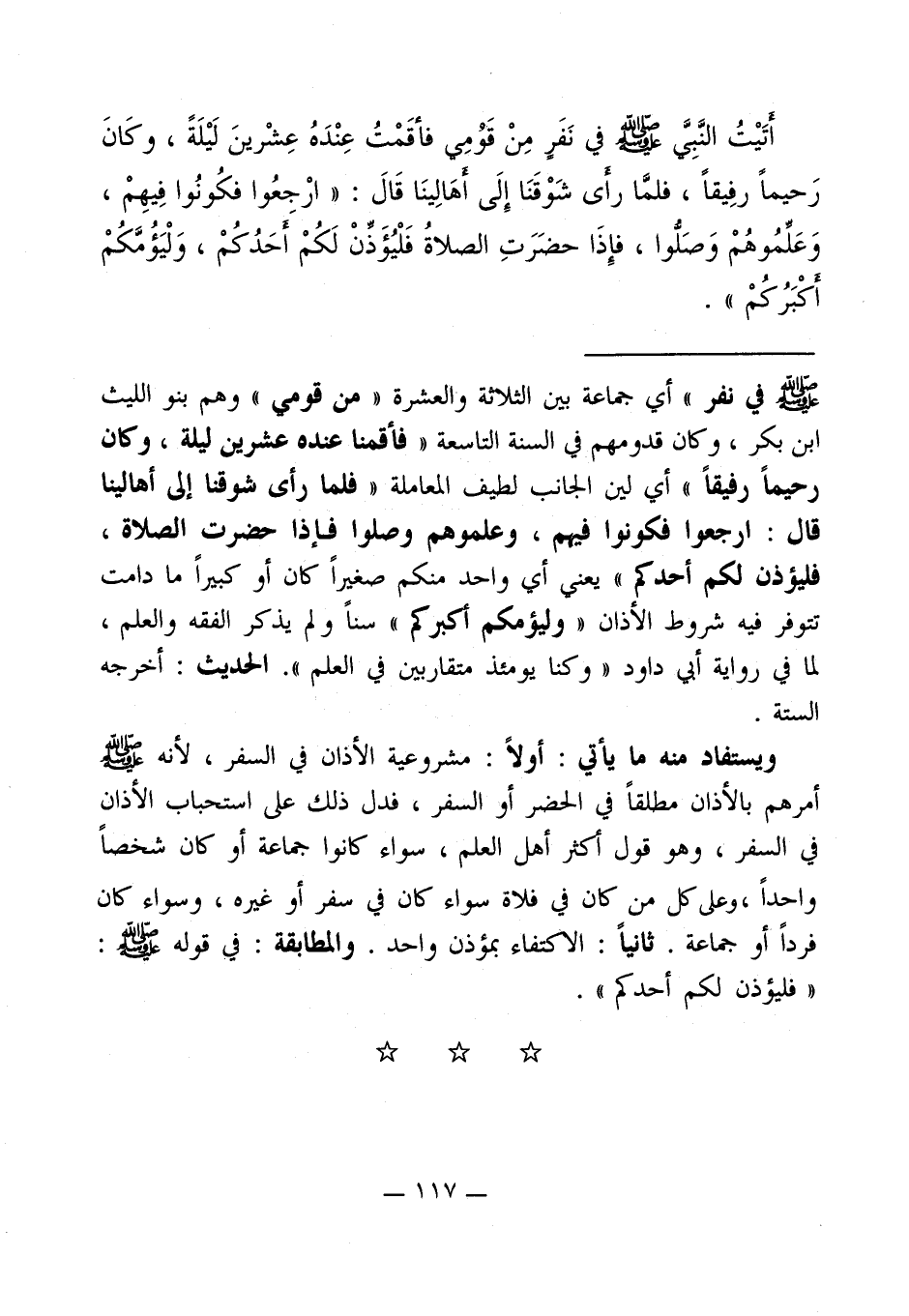 - صلى الله عليه وسلم - في نفر" أي جماعة بين الثلاثة والعشرة " من قومي " وهم بنو الليث ابن بكر، وكان قدومهم في السنة التاسعة " فأقمنا عنده عشرين ليلة، وكان رحيماً رفيقاً " أي لين الجانب لطيف المعاملة " فلما رأى شوقنا إلى أهالينا قال: ارجعوا فكونوا فيهم، وعلموهم وصلوا فإذا حضرت الصلاة، فيؤذن لكم أحدكم " يعني أي واحد منكم صغيراً كان أو كبيراً ما دامت تتوفر فيه شروط الأذان " وليؤمكم أكبرم " سناً ولم يذكر الفقه والعلم، لما في رواية أبي داود " وكنا يومئذ متقاربين في العلم ". الحديث: أخرجه الستة.
