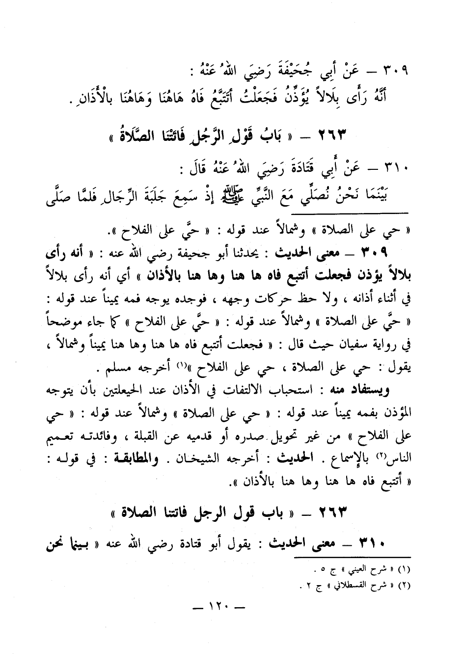 309 - معنى الحديث: يحدثنا أبو جحيفة رضي الله عنه: " أنه رأى بلالاً يؤذن فجعلت أتتبع فاه ها هنا وها هنا بالأذان " أي أنه رأى بلالاً في أثناء أذانه، ولا حظ حركات وجهه، فوجده يوجه فمه يميناً عند قوله: " حيَّ على الصلاة " وشمالاً عند قوله: " حيَّ على الفلاح " كما جاء موضحاً في رواية سفيان حيث قال: " فجعلت أتتبع فاه ها هنا وها هنا يميناً وشمالاً، يقول: حي على الصلاة، حي على الفلاح " (¬1) أخرجه مسلم.