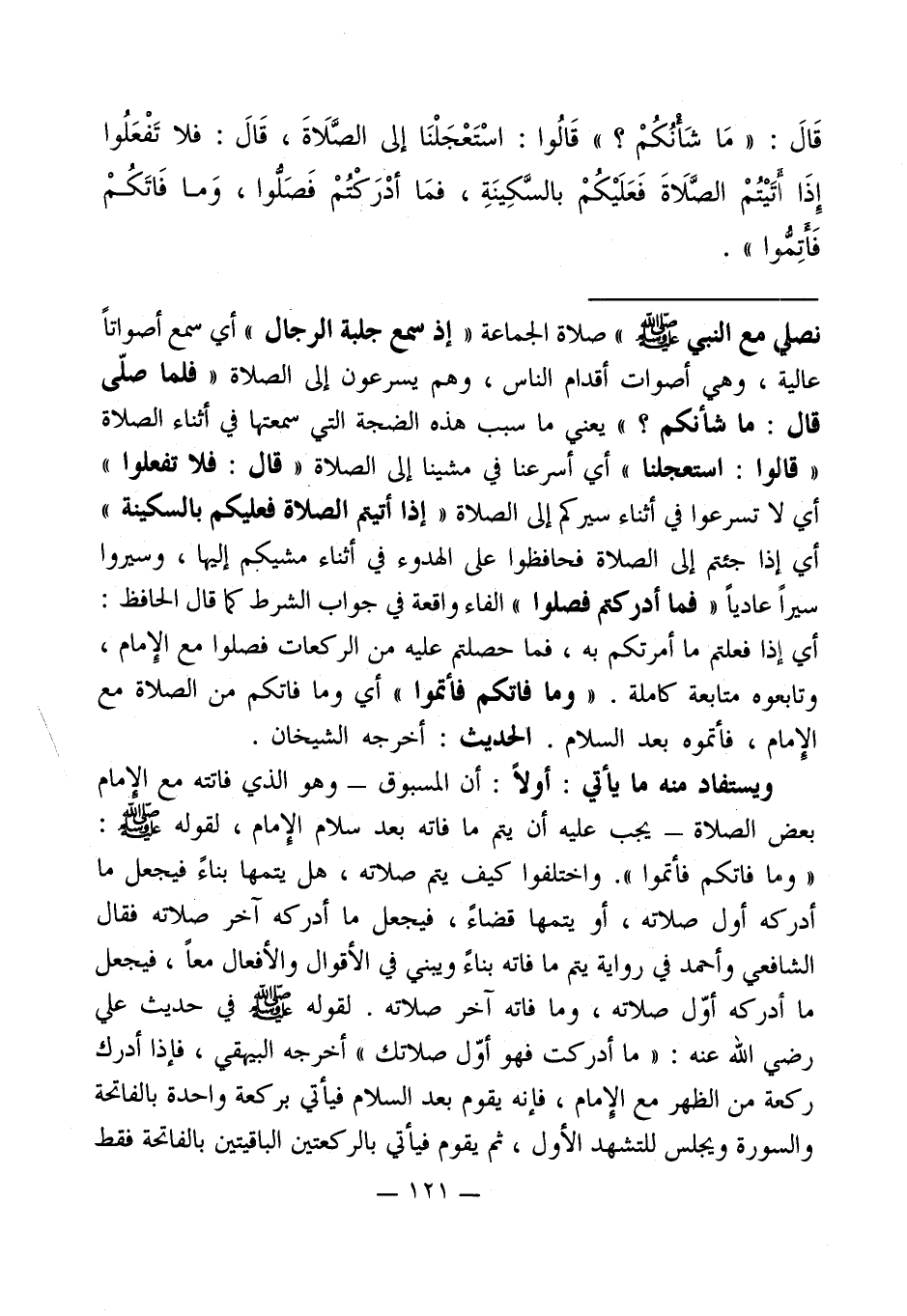 نصلي مع النبي - صلى الله عليه وسلم -" صلاة الجماعة " إذ سمع جلبة الرجال " أي سمع أصواتاً عالية، وهي أصوات أقدام الناس، وهم يسرعون إلى الصلاة " فلما صلّى قال: ما شأنكم؟ " يعني مما سبب هذه الضجة التي سمعتها في أثناء الصلاة " قالوا: استعجلنا " أي أسرعنا في مشينا إلى الصلاة " قال: فلا تفعلوا " أي لا تسرعوا في أثناء سيركم إلى الصلاة " إذا أتيتم الصلاة فعليكم بالسكينة " أي إذا جئتم إلى الصلاة فحافظوا على الهدوء في أثناء مشيكم إليها، وسيروا سيراً عادياً " فما أدركتم فصلوا " الفاء واقعة في جواب الشرط كما قال الحافظ: أي إذا فعلتم ما أمرتكم به، فما حصلتم عليه من الركعات فصلوا مع الإِمام، وتابعوه متابعة كاملة. " وما فاتكم فأتموا " أي وما فاتكم من الصلاة مع الإِمام، فأتموه بعد السلام. الحديث: أخرجه الشيخان.
