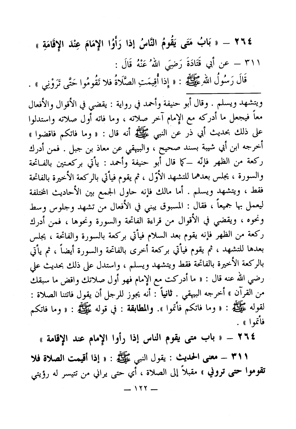 311 - معنى الحديث: يقول النبي - صلى الله عليه وسلم -: " إذا أقيمت الصلاة فلا تقوموا حتى تروني " مقبلاً إلى الصلاة، أي حتى يراني من تتيسر له رؤيتي
