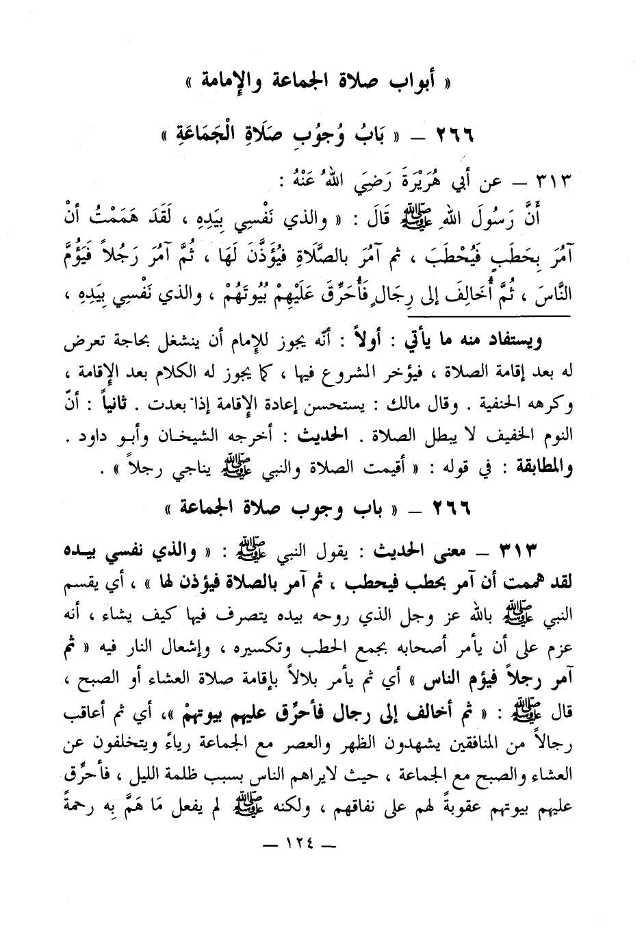 313 - معنى الحديث: يقول النبي - صلى الله عليه وسلم -: "والذي نفسي بيده لقد هممت أن آمر بحطب فيحطب، ثم آمر بالصلاة فيؤذن لها "، أي يقسم النبي - صلى الله عليه وسلم - بالله عز وجل الذي روحه بيده يتصرف فيها كيف يشاء، أنه عزم على أن يأمر أصحابه بجمع الحطب وتكسيره، وإشعال النار فيه " ثم آمر رجلاً فيؤم الناس " أي ثم يأمر بلالاً بإقامة صلاة العشاء أو الصبح، قال - صلى الله عليه وسلم -: " ثم أخالف إلى رجال فأحرِّق عليهم بيوتهمْ "، أي ثم أعاقب رجالاً من المنافقين يشهدون الظهر والعصر مع الجماعة رياءً ويتخلفون عن العشاء والصبح مع الجماعة، حيث لا يراهم الناس بسبب ظلمة الليل، فأحرِّق عليهم بيوتهم عقوبةً لهم على نفاقهم، ولكنه - صلى الله عليه وسلم - لم يفعل مَا هَمَّ بِه رحمةً