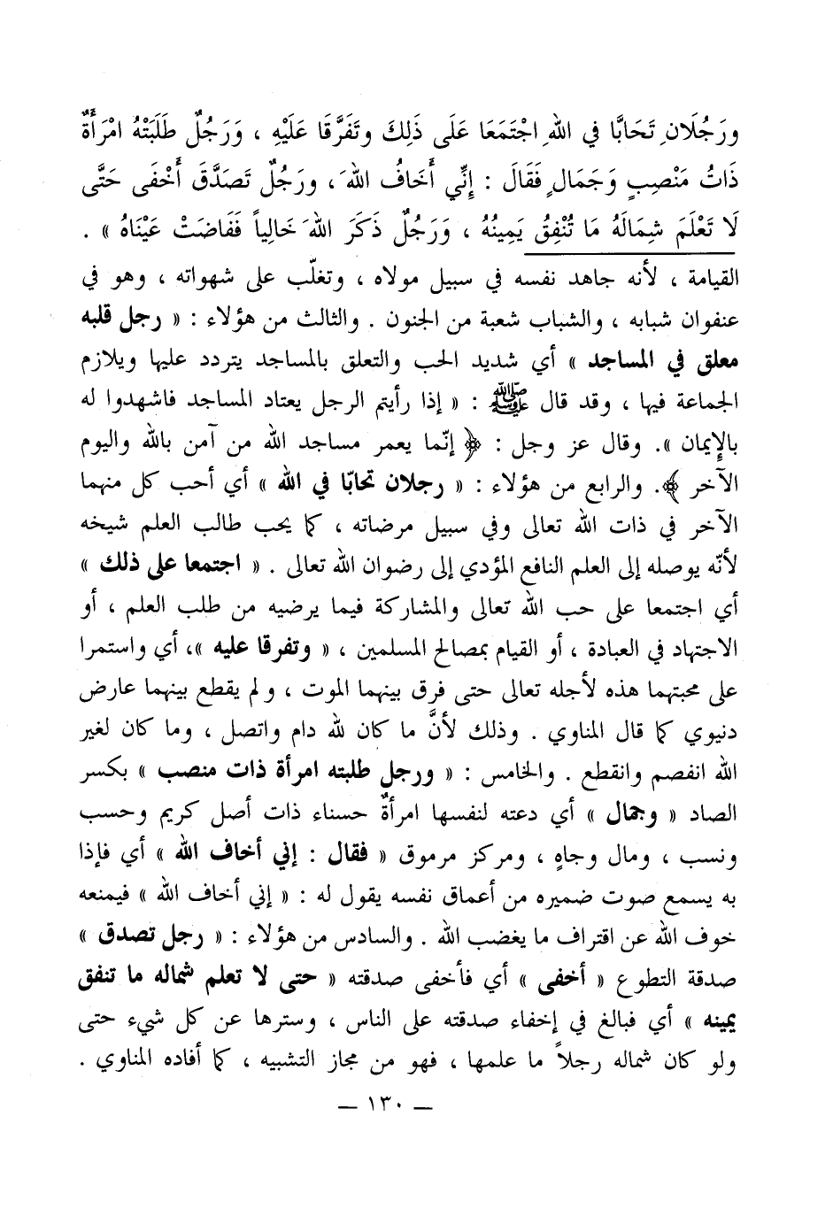 القيامة، لأنه جاهد نفسه في سبيل مولاه، وتغلّب على شهواته، وهو في عنفوان شبابه، والشباب شعبة من الجنون. والثالث من هؤلاء: " رجل قلبه معلق في المساجد " أي شديد الحب والتعلق بالمساجد يتردد عليها ويلازم الجماعة فيها، وقد قال - صلى الله عليه وسلم -: "إذا رأيتم الرجل يعتاد المساجد فاشهدوا له بالإيمان ". وقال عز وجل: (إِنَّمَا يَعْمُرُ مَسَاجِدَ اللَّهِ مَنْ آَمَنَ بِاللَّهِ وَالْيَوْمِ الْآَخِرِ). والرابع من هؤلاء: " رجلان تحابّا في الله " أي أحب كل منهما الآخر في ذات الله تعالى وفي سبيل مرضاته، كما يحب طالب العلم شيخه لأنّه يوصله إلى العلم النافع المؤدي إلى رضوان الله تعالى. " اجتمعا على ذلك " أي اجتمعا على حب الله تعالى والمشاركة فيما يرضيه من طلب العلم، أو الاجتهاد في العبادة، أو القيام بمصالح المسلمين، " وتفرقا عليه "، أي واستمرا على محبتهما هذه لأجله تعالى حتى فرق بينهما الموت، ولم يقطع بينهما عارض دنيوي كما قال المناوي. وذلك لأنَّ ما كان لله دام واتصل، وما كان لغير الله انفصم وانقطع. والخامس: " ورجل طلبته امرأة ذات منصب " بكسر الصاد " وجمال " أي دعته لنفسها امرأةٌ حسناء ذات أصل كريم وحسب ونسب، ومال وجاهٍ، ومركز مرموق " فقال: إني أخاف الله " أي فإذا به يسمع صوت ضميره من أعماق نفسه يقول له: " إني أخاف الله " فيمنعه خوف الله عن اقتراف ما يغضب الله. والسادس من هؤلاء: " رجل تصدق " صدقة التطوع " أخفى " أي فأخفى صدقته " حتى لا تعلم شماله ما تنفق يمينه " أي فبالغ في إخفاء صدقته على الناس، وسترها عن كل شيء حتى ولو كان شماله رجلاً ما علمها، فهو من مجاز التشبيه، كما أفاده المناوي.