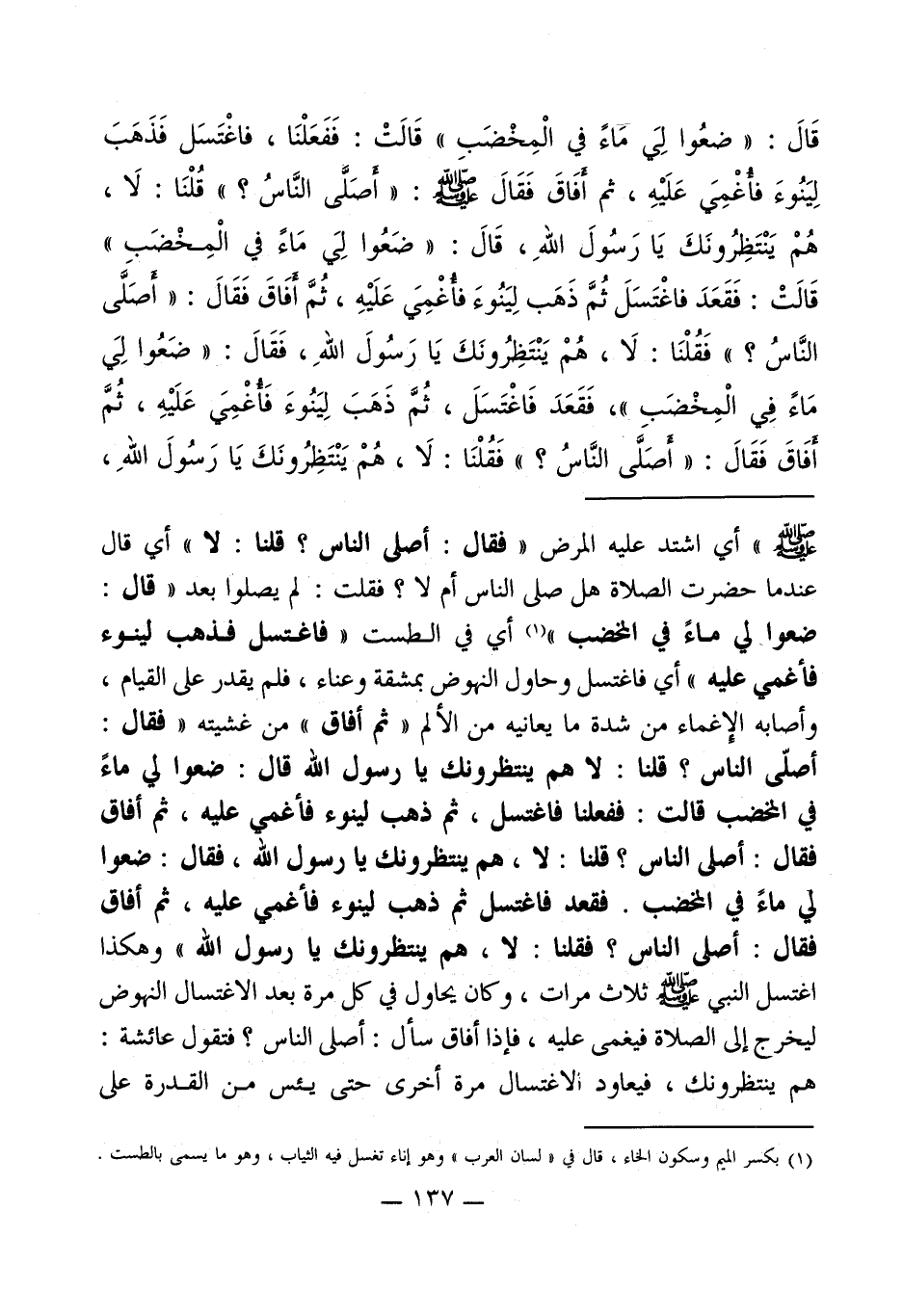 - صلى الله عليه وسلم -" أي اشتد عليه المرض " فقال: أصلى الناس؟ قلنا: لا " أي قال عندما حضرت الصلاة هل صلى الناس أم لا؟ فقلت: لم يصلوا بعد " قال: ضعوا لي ماءً في المخضب " (¬1) أي في الطست " فاغتسل فذهب لينوء فأغمي عليه " أي فاغتسل وحاول النهوض بمشقة وعناء، فلم يقدر على القيام، وأصابه الإغماء من شدة ما يعانيه من الألم " ثم أفاق " من غشيته " فقال: أصلّى الناس؟ قلنا: لا هم ينتظرونك يا رسول الله قال: ضعوا لي ماءً في المخضب قالت: ففعلنا فاغتسل، ثم ذهب لينوء فأغمي عليه، ثم أفاق فقال: أصلى الناس؟ قلنا: لا، هم ينتظرونك يا رسول الله، فقال: ضعوا لي ماءً في المخضب. فقعد فاغتسل ثم ذهب لينوء فأغمي عليه، ثم أفاق فقال: أصلى الناس؟ فقلنا: لا، هم ينتظرونك يا رسول الله " وهكذا أغتسل النبي - صلى الله عليه وسلم - ثلاث مرات، وكان يحاول في كل مرة بعد الاغتسال النهوض ليخرج إلى الصلاة فيغمى عليه، فإذا أفاق سأل: أصلى الناس؟ فتقول عائشة: هم ينتظرونك، فيعاود الاغتسال مرة أخرى حتى يئس من القدرة على