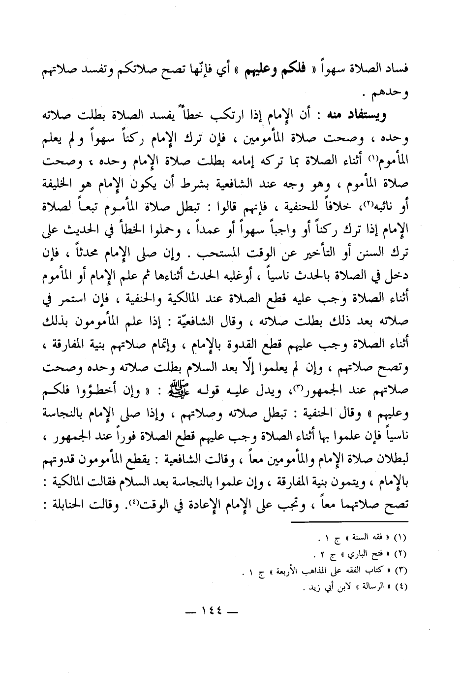 ويستفاد منه: أن الإِمام إذا ارتكب خطأً يفسد الصلاة بطلت صلاته وحده، وصحت صلاة المأمومين، فإن ترك الإمام ركناً سهواً ولم يعلم المأموم (¬1) أثناء الصلاة بما تركه إمامه بطلت صلاة الإمام وحده، وصحت صلاة المأموم، وهو وجه عند الشافعية بشرط أن يكون الإمام هو الخليفة أو نائبه (¬2)، خلافاً للحنفية، فإنهم قالوا: تبطل صلاة المأموم تبعاً لصلاة الإِمام إذا ترك ركناً أو واجباً سهواً أو عمداً، وحملوا الخطأ في الحديث على ترك السنن أو التأخير عن الوقت المستحب. وإن صلى الإِمام محدثاً، فإن دخل في الصلاة بالحدث ناسياً، أو غلبه الحدث أثناءها ثم علم الإِمام أو المأموم أثناء الصلاة وجب عليه قطع الصلاة عند المالكية والحنفية، فإن استمر في صلاته بعد ذلك بطلت صلاته، وقال الشافعيّة: إذا علم المأمومون بذلك أثناء الصلاة وجب عليهم قطع القدوة بالإِمام، وإتمام صلاتهم بنية المفارقة، وتصح صلاتهم، وإن لم يعلموا إلاّ بعد السلام بطلت صلاته وحده وصحت صلاتهم عند الجمهور (¬3)، ويدل عليه قوله - صلى الله عليه وسلم -: " وإن أخطؤوا فلكم وعليهم " وقال الحنفية: تبطل صلاته وصلاتهم، وإذا صلى الإمام بالنجاسة ناسياً فإن علموا بها أثناء الصلاة وجب عليهم قطع الصلاة فوراً عند الجمهور، لبطلان صلاة الإِمام والمأمومين معاً، وقالت الشافعية: يقطع المأمومون قدوتهم بالإمام، ويتمون بنية المفارقة، وإن علموا بالنجاسة بعد السلام فقالت المالكية: تصح صلاتهما معاً، وتجب على الإِمام الإعادة في الوقت (¬4). وقالت الحنابلة: