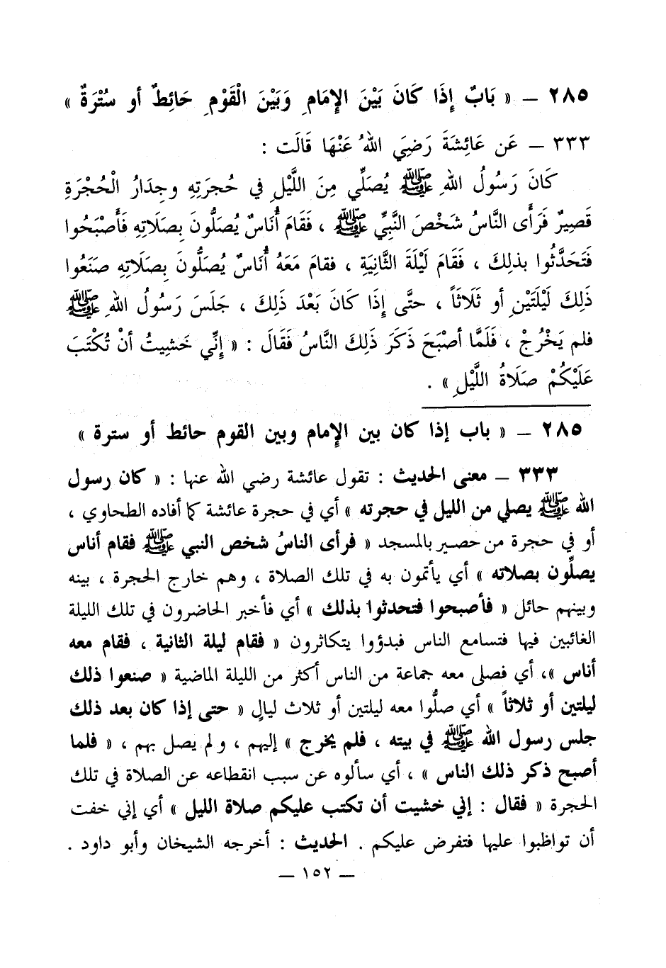 333 - معنى الحديث: تقول عائشة رضي الله عنها: " كان رسول الله - صلى الله عليه وسلم - يصلي من الليل في حجرته " أي في حجرة عائشة كما أفاده الطحاوي، أو في حجرة من حصير بالمسجد " فرأى الناسُ شخص النبي - صلى الله عليه وسلم - فقام أناس يصلِّون بصلاته " أي يأتمون به في تلك الصلاة، وهم خارج الحجرة، بينه وبينهم حائل " فأصبحوا فتحدثوا بذلك " أي فأخبر الحاضرون في تلك الليلة الغائبين فيها فتسامع الناس فبدؤوا يتكاثرون " فقام ليلة الثانية، فقام معه أناس "، أي فصلى معه جماعة من الناس أكثر من الليلة الماضية " صنعوا ذلك ليلتين أو ثلاثاً " أي صلُّوا معه ليلتين أو ثلاث ليالٍ " حتى إذا كان بعد ذلك جلس رسول الله - صلى الله عليه وسلم - في بيته، فلم يخرج " إليهم، ولم يصل بهم، " فلما أصبح ذكر ذلك الناس "، أي سألوه عن سبب انقطاعه عن الصلاة في تلك الحجرة " فقال: إني خشيت أن تكتب عليكم صلاة الليل " أي إني خفت أن تواظبوا عليها فتفرض عليكم. الحديث: أخرجه الشيخان وأبو داود.