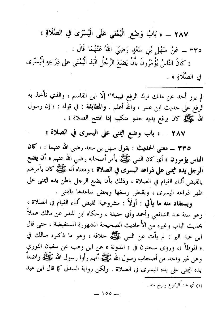 335 - معنى الحديث: يقول سهل بن سعد رضي الله عنهما: " كان الناس يؤمرون " أي كان النبي - صلى الله عليه وسلم - يأمر أصحابه رضي الله عنهم " أن يضع الرجل يده اليمنى على ذراعه اليسرى في الصلاة " ومعناه أنه - صلى الله عليه وسلم - كان يأمرهم بالقبض أثناء القيام في الصلاة، وذلك بأن يضع الرجل باطن يده اليمنى على ظهر ذراعه اليسرى، ويقبض رسغها وبعض ساعدها باليمنى.