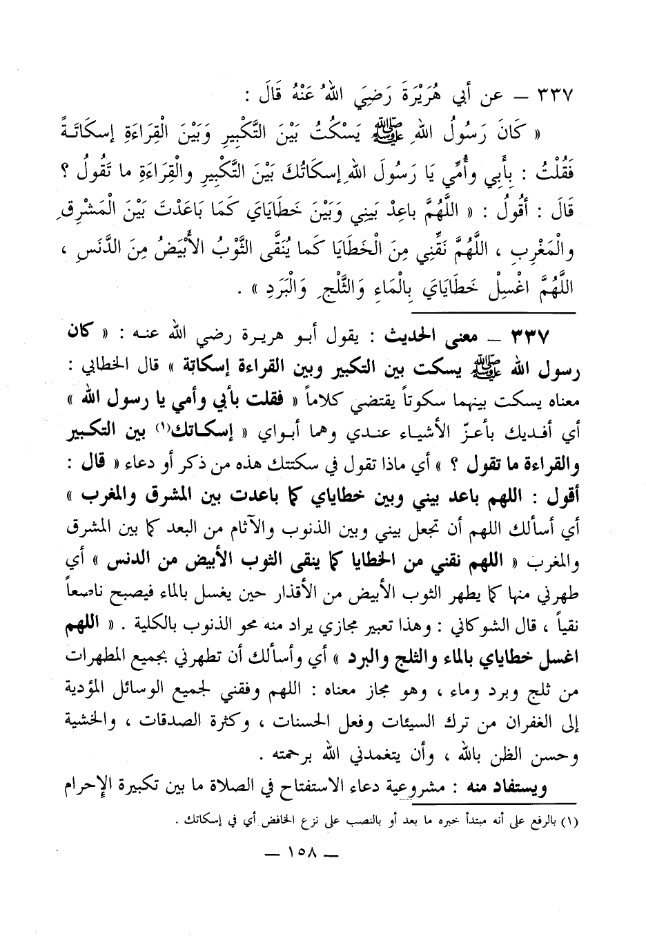 337 - معنى الحديث: يقول أبو هريرة رضي الله عنه: " كان رسول الله - صلى الله عليه وسلم - يسكت بين التكبير وبين القراءة إسكاتة " قال الخطابي: معناه يسكت بينهما سكوتاً يقتضى كلاماً " فقلت بأبي وأمي يا رسول الله " أي أفديك بأعزّ الأشياء عندي وهما أبواي " إسكاتك (¬1) بين التكبير والقراءة ما تقول؟ " أي ماذا تقول في سكتتك هذه من ذكر أو دعاء " قال: أقول: اللهم باعد بيني وبين خطاياي كما باعدت بين المشرق والمغرب " أي أسألك اللهم أن تجعل بيني وبين الذنوب والآثام من البعد كما بين المشرق والمغرب " اللهم نقني من الخطايا كما ينقى الثوب الأبيض من الدنس " أي طهرني منها كما يطهر الثوب الأبيض من الأقذار حين يغسل بالماء فيصبح ناصعاً نقياً، قال الشوكاني: وهذا تعبير مجازي يراد منه محو الذنوب بالكلية. " اللهم أغسل خطاياي بالماء والثلج والبرد " أي وأسألك أن تطهرني بجميع المطهرات من ثلج وبرد وماء، وهو مجاز معناه: اللهم وفقني لجميع الوسائل المؤدية إلى الغفران من ترك السيئات وفعل الحسنات، وكثرة الصدقات، والخشية وحسن الظن بالله، وأن يتغمدني الله برحمته.