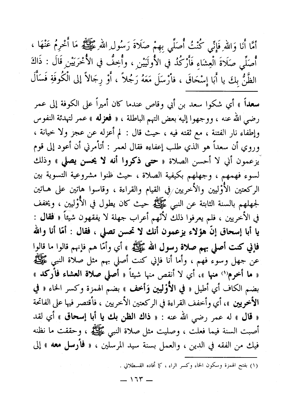 أمَّا أنا وَاللهِ فَإِنِّي كُنْتُ اُّصَلِّي بِهِمْ صَلَاةَ رَسُولِ اللهِ - صلى الله عليه وسلم - مَا أَخْرِمُ عَنْهَا، أصَلِّي صَلَاةَ الْعِشَاءِ فَأَرْكُدُ في الاُّولَيَيْنِ، واُّخِفُّ في الأخْرَيَيْنِ قَال: ذَاكَ الظنُّ بِكَ يا أَبَا إِسْحَاقَ، فأرْسَلَ مَعَهُ رَجُلاً، أَوْ رِجَالاً إلى الْكُوفَةِ فَسَأَل