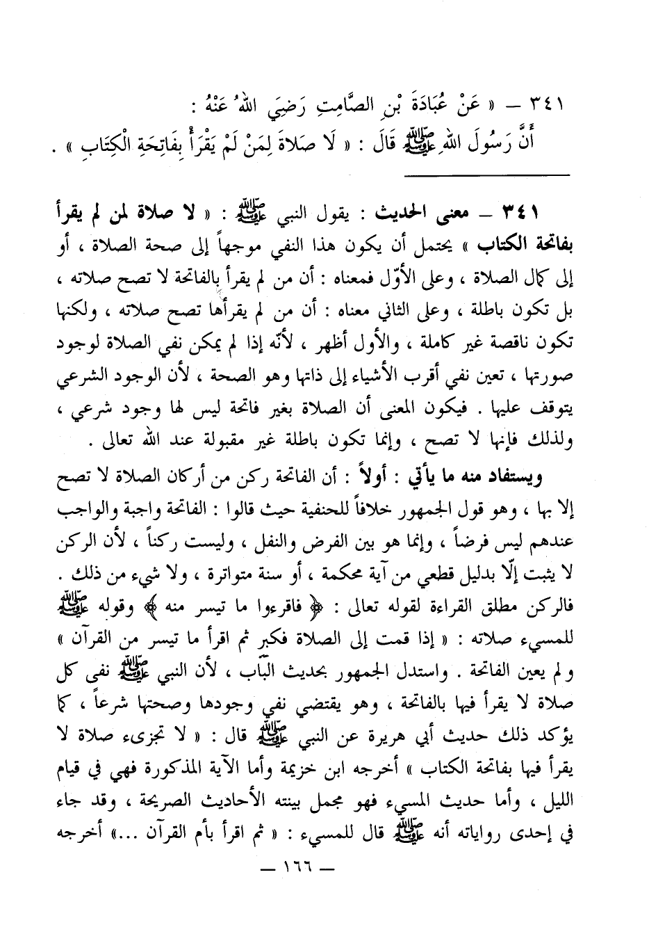 341 - معنى الحديث: يقول النبي - صلى الله عليه وسلم -: " لا صلاة لمن لم يقرأ بفاتحة الكتاب " يحتمل أن يكون هذا النفي موجهاً إلى صحة الصلاة، أو إلى كمال الصلاة، وعلى الأوّل فمعناه: أن من لم يقرأ بالفاتحة لا تصح صلاته، بل تكون باطلة، وعلى الثاني معناه: أن من لم يقرأها تصح صلاته، ولكنها تكون ناقصة غير كاملة، والأول أظهر، لأنّه إذا لم يمكن نفي الصلاة لوجود صورتها، تعين نفي أقرب الأشياء إلى ذاتها وهو الصحة، لأن الوجود الشرعي يتوقف عليها. فيكون المعنى أن الصلاة بغير فاتحة ليس لها وجود شرعي، ولذلك فإنها لا تصح، وإنما تكون باطلة غير مقبولة عند الله تعالى.