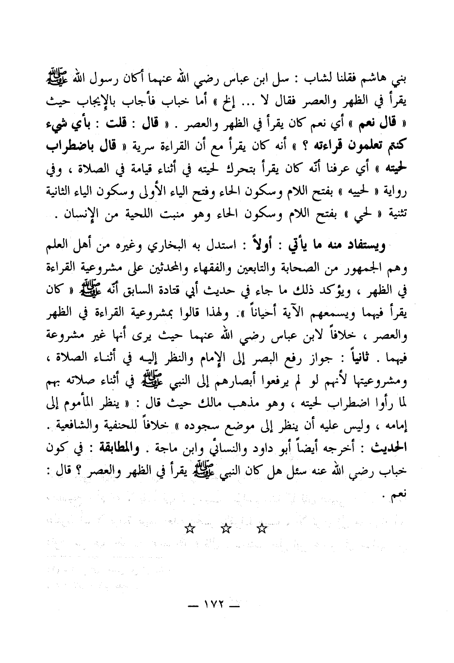بني هاشم فقلنا لشاب: سل ابن عباس رضي الله عنهما أكان رسول الله - صلى الله عليه وسلم - يقرأ في الظهر والعصر فقال لا ... إلخ" أما خباب فأجاب بالإِيجاب حيث " قال نعم " أي نعم كان يقرأ في الظهر والعصر. " قال: قلت: بأي شيء كنتم تعلمون قراءته؟ " أنه كان يقرأ مع أن القراءة سرية " قال باضطراب لحيته " أي عرفنا أنّه كان يقرأ بتحرك لحيته في أثناء قيامة في الصلاة، وفي رواية " لحييه " بفتح اللام وسكون الحاء وفتح الياء الأولى وسكون الياء الثانية تثنية " لحي " بفتح اللام وسكون الحاء وهو منبت اللحية من الإنسان.