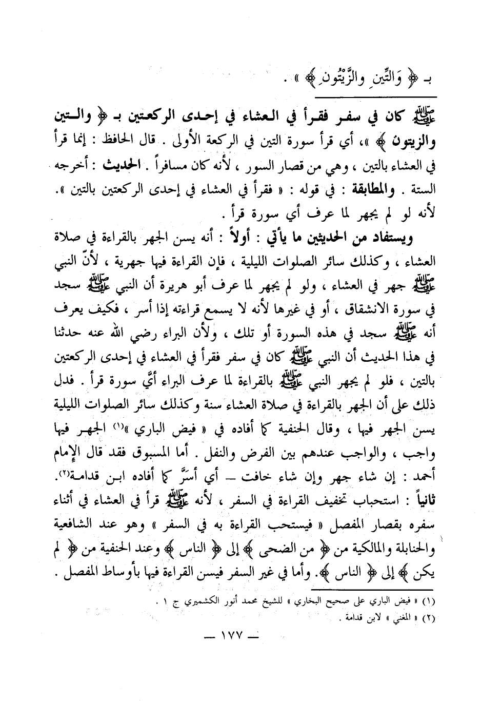 - صلى الله عليه وسلم - كان في سفر فقرأ في العشاء في إحدى الركعتين بـ (وَالتِّينِ وَالزَّيْتُونِ) "، أي قرأ سورة التين في الركعة الأولى. قال الحافظ: إنما قرأ في العشاء بالتين، وهي من قصار السور، لأنه كان مسافراً. الحديث: أخرجه الستة. والمطابقة: في قوله: " فقرأ في العشاء في إحدى الركعتين بالتين ".