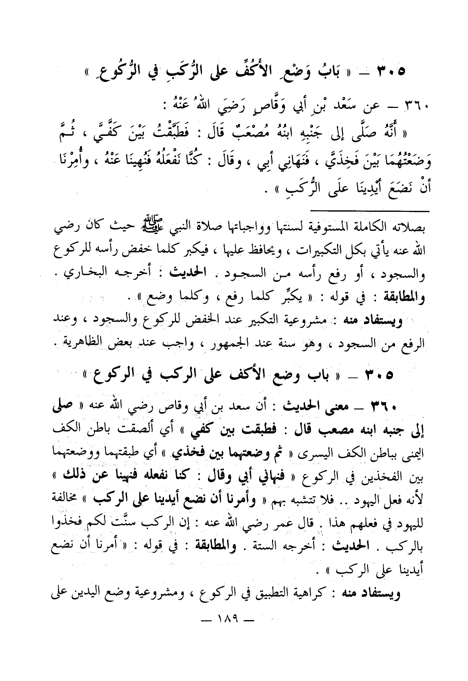 360 - معنى الحديث: أن سعد بن أبي وقاص رضي الله عنه " صلى إلى جنبه ابنه مصعب قال: فطبقت بين كفي " أي ألصقت باطن الكف اليمنى بباطن الكف اليسرى " ثم وضعتهما بين فخذي. " أي طبقتهما ووضعتهما بين الفخذين في الركوع " فنهاني أبي وقال: كنا نفعله فنهنا عن ذلك " لأنه فعل اليهود .. فلا تتشبه بهم " وأمرنا أن نضع أيدينا على الركب " مخالفة لليهود في فعلهم هذا قال عمر رضي الله عنه: إن الركب سنَّت لكم فخذوا بالركب. الحديث: أخرجه الستة. والمطابقة: في قوله: " أمرنا أن نضع أيدينا على الركب ".