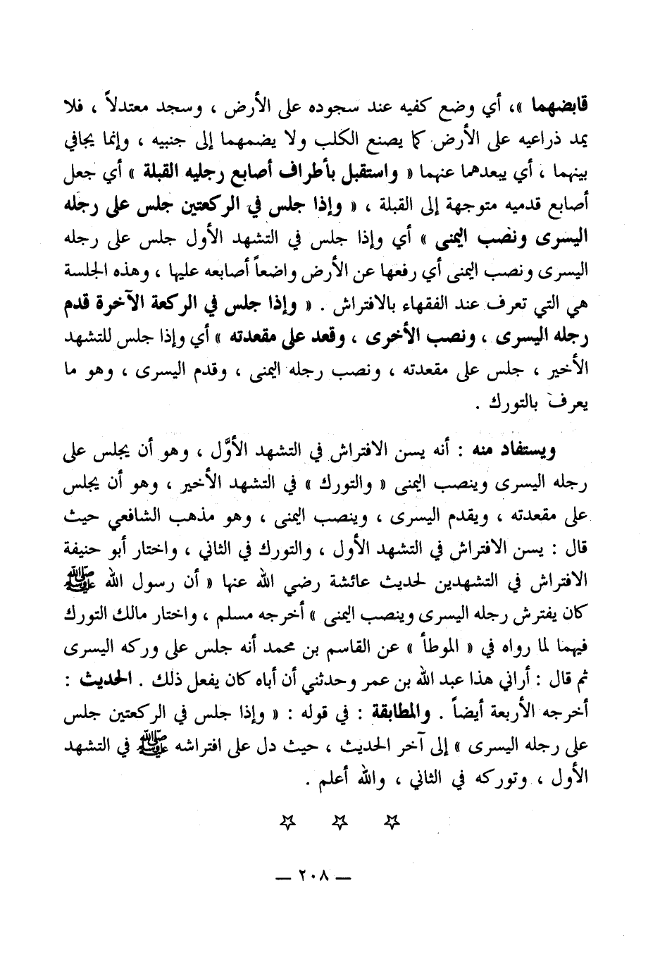 قابضهما"، أي وضع كفيه عند سجوده على الأرض، وسجد معتدلاً، فلا يمد ذراعيه على الأرض كما يصنع الكلب ولا يضمهما إلى جنبيه، وإنما يجافي بينهما، أي يبعدهما عنهما " واستقبل بأطراف أصابع رجليه القبلة " أي جعل أصابع قدميه متوجهة إلى القبلة، " وإذا جلس في الركعتين جلس على رجله اليسرى ونصب اليمنى " أي وإذا جلس في التشهد الأول جلس على رجله اليسرى ونصب اليمنى أي رفعها عن الأرض واضعاً أصابعه عليها، وهذه الجلسة هي التي تعرف عند الفقهاء بالافتراش. " وإذا جلس في الركعة الآخرة قدم رجله اليسرى، ونصب الأخرى، وقعد على مقعدته " أي وإذا جلس للتشهد الأخير، جلس على مقعدته، ونصب رجله اليمنى، وقدم اليسرى، وهو ما يعرف بالتورك.