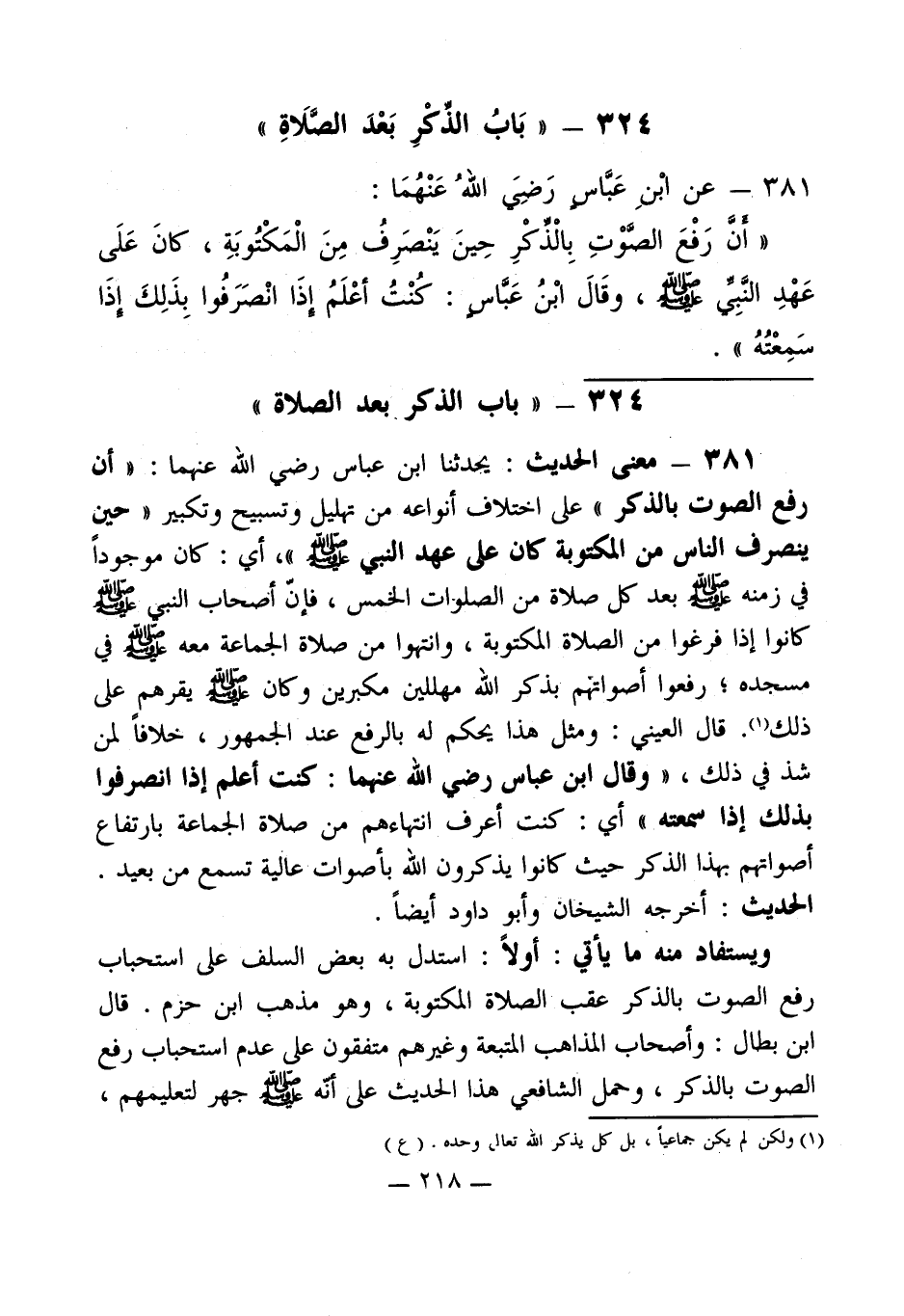 " أنَ رَفْعَ الصَّوْتِ بِالْذِّكْرِ حِينَ يَنْصَرِفُ مِنَ الْمَكْتُوبَةِ، كانَ عَلَى عَهْدِ النَبِيِّ - صلى الله عليه وسلم -، وقَالَ ابْنُ عَبَّاسٍ: كُنْتُ أعْلَمُ إذَا انْصَرَفُوا بِذَلِكَ إذَا سَمِعْتُهُ ".