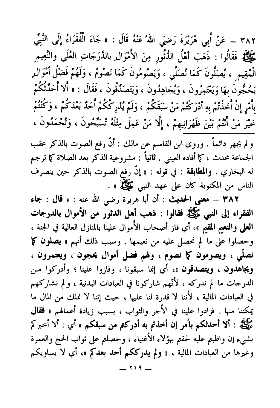 382 - عَنْ أبِي هُرَيْرَةَ رَضِيَ اللهُ عَنْهُ قَالَ: " جَاءَ الْفُقَرَاءُ إلَى النَّبِيِّ - صلى الله عليه وسلم - فقالُوا: ذَهَبَ أهل الدثُورِ مِنَ الأمْوَالِ بالدَّرَجَاتِ العُلَى والنَّعِيمِ الْمُقِيمِ، يُصَلُّونَ كَمَا نُصَلِّي، وَيَصُومُونَ كَمَا نَصُومُ، وَلَهُمْ فَضْلُ أمْوَالٍ يَحُجُّونَ بِهَا وَيَعْتَمِرُونَ، وَيُجَاهِدُونَ، وَيَتَصَدِّقُونَ، فَقَالَ: "ألا أحَدِّثُكُمْ بِأمْرٍ إنْ أخَذْتُمْ بِهِ أدْرَكتُمْ مَنْ سَبَقَكُمْ، وَلَمْ يُدْرِكْكُمْ أحَدٌ بَعْدَكُمْ، وَكُنْتُمْ خَير مَنْ أنتمْ بَيْنَ ظَهْرَانِيهِمْ، الَّا مَنْ عَمِلَ مِثْلَهُ تُسَبِّحُونَ، وَتُحْمَدُونَ،