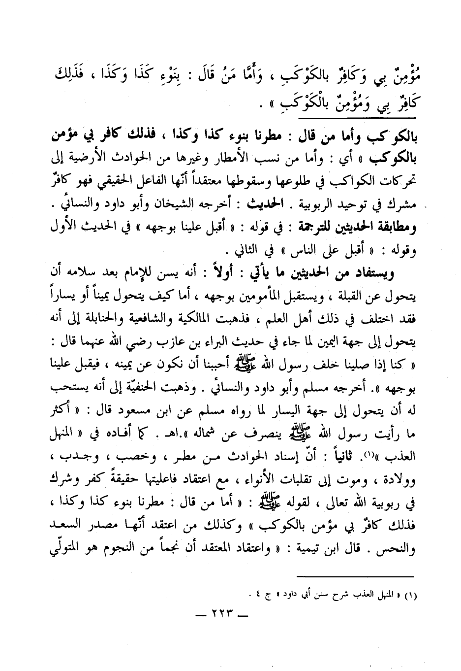 ويستفاد من الحديثين ما يأتي: أولاً: أنه يسن للإمام بعد سلامه أن يتحول عن القبلة، ويستقبل المأمومين بوجهه، أما كيف يتحول يميناً أو يساراً فقد اختلف في ذلك أهل العلم، فذهبت المالكية والشافعية والحنابلة إلى أنه يتحول إلى جهة اليمين لما جاء في حديث البراء بن عازب رضي الله عنهما قال: " كنا إذا صلينا خلف رسول الله - صلى الله عليه وسلم - أحببنا أن نكون عن يمينه، فيقبل علينا بوجهه ". أخرجه مسلم وأبو داود والنسائي. وذهبت الحنفيّة إلى أنه يستحب له أن يتحول إلى جهة اليسار لما رواه مسلم عن ابن مسعود قال: " أكثر ما رأيت رسول الله - صلى الله عليه وسلم - ينصرف عن شماله ". اهـ. كما أفاده في " المنهل العذب " (¬1). ثانياً: أنّ إسناد الحوادث من مطر، وخصب، وجدب، وولادة، وموت إلى تقلبات الأنواء، مع اعتقاد فاعليتها حقيقةً كفر وشرك في ربوبية الله تعالى، لقوله - صلى الله عليه وسلم -: " أما من قال: مطرنا بنوء كذا وكذا، فذلك كافرٌ بي مؤمن بالكوكب " وكذلك من اعتقد أنها مصدر السعد والنحس. قال ابن تيمية: "واعتقاد المعتقد أن نجماً من النجوم هو المتولّي