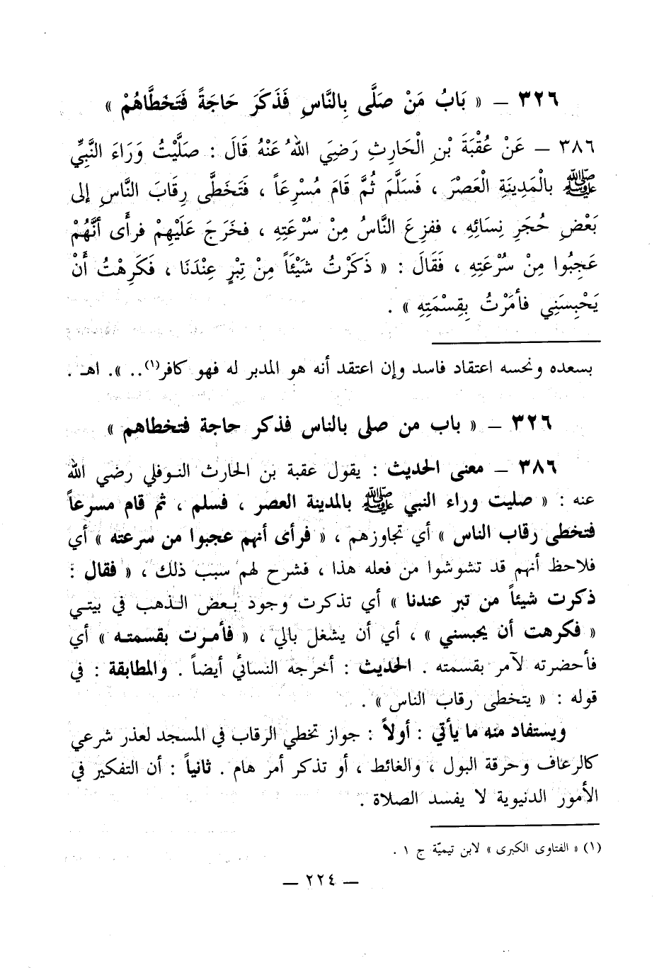 326 - " بَابُ مَنْ صَلَّى بِالنَّاسِ فَذَكَرَ حَاجَةً فتخطَّاهُمْ "